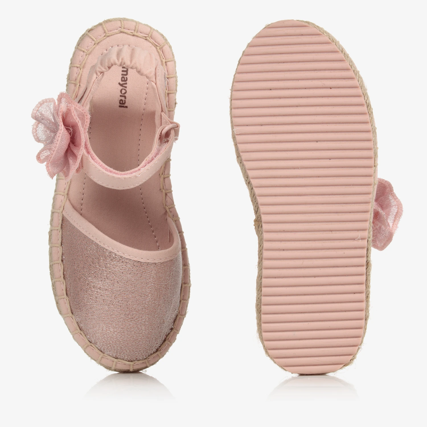 Sparkly pink espadrille sandals for teen girls by Mayoral, made with soft textile uppers. They have chic hessian trims and a pretty detachable 3D floral appliqué on the velcro fastening strap. They are lined in soft textile and have a non-slip rubber sole.
