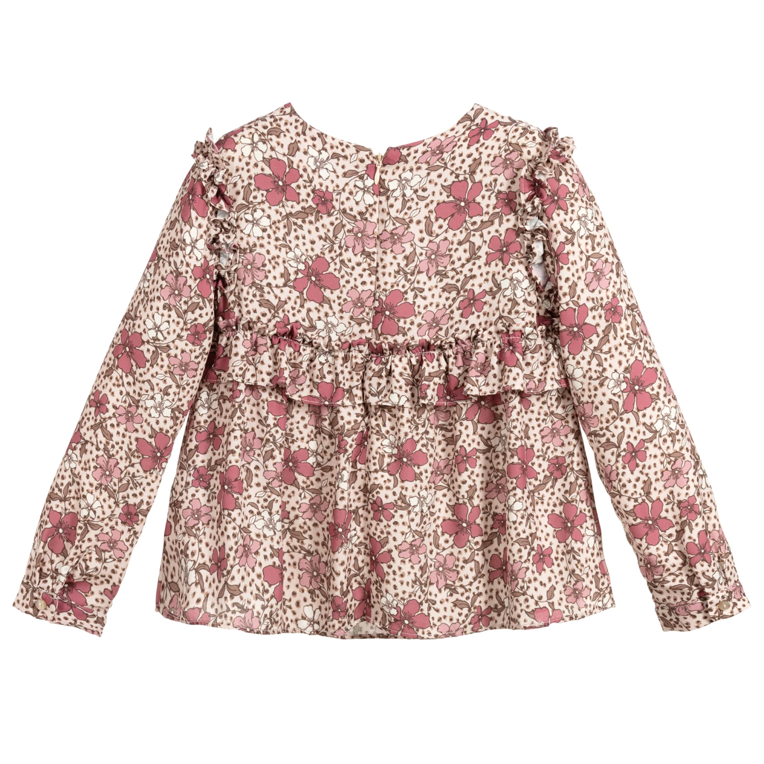 Beige and pink blouse for teen girls by Mayoral, made in soft lightweight floral crêpe. It is gathered and has ruffle trim on the front, back and shoulders