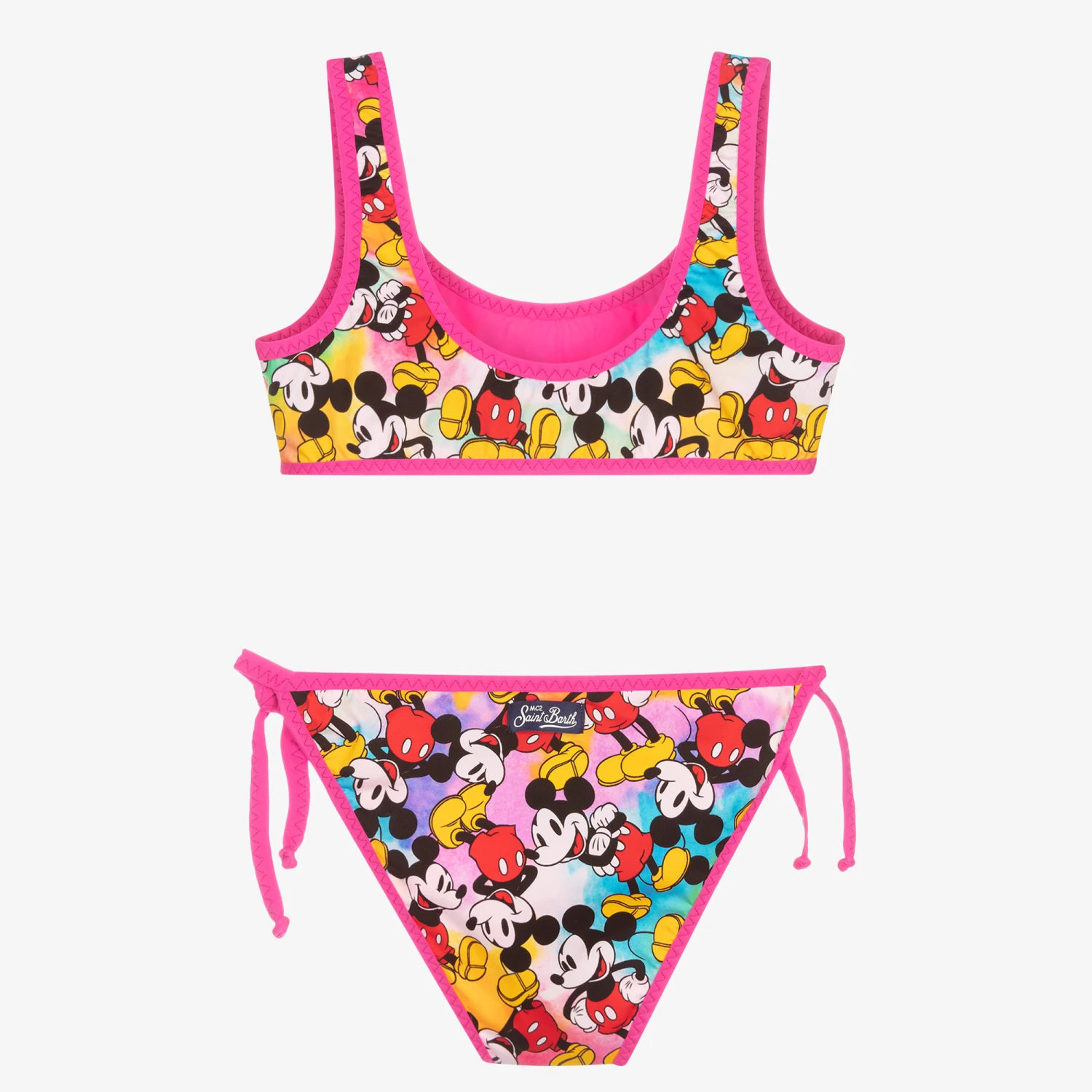 Teen girls neon pink bikini by MC2 Saint Barth, with a vibrant Disney Mickey Mouse print over a pastel background. In a bralette style, the triangle bikini top is made in stretchy and silky lycra, and it pairs with matching bottoms with bows on the sides.
