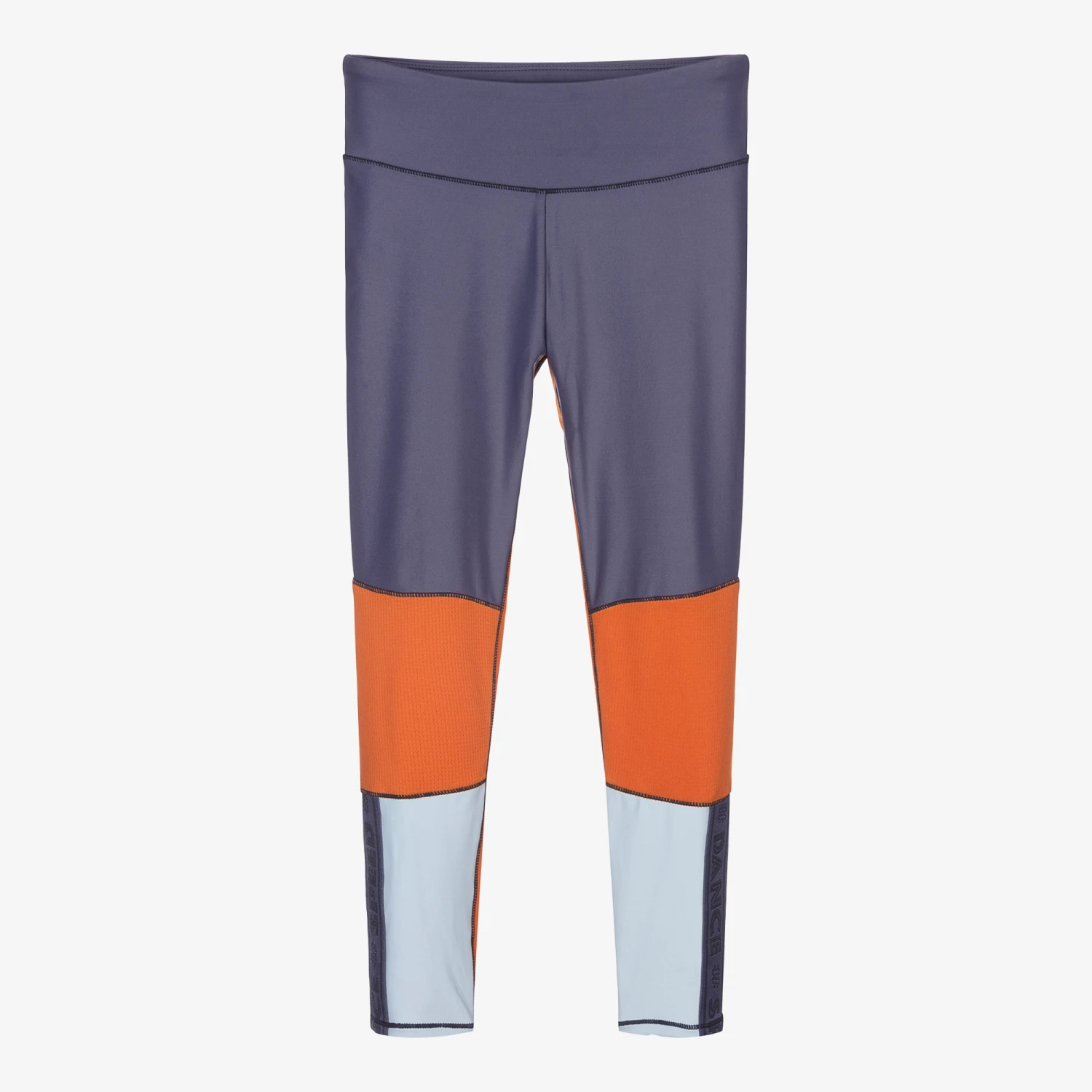 Sporty blue colourblock leggings for teen girls, by Danish brand Molo, made from silky, stretchy technical polyester to keep you cool during sports. They have sporty slogan and logo prints on the sides, as well as orange contrasting panels.