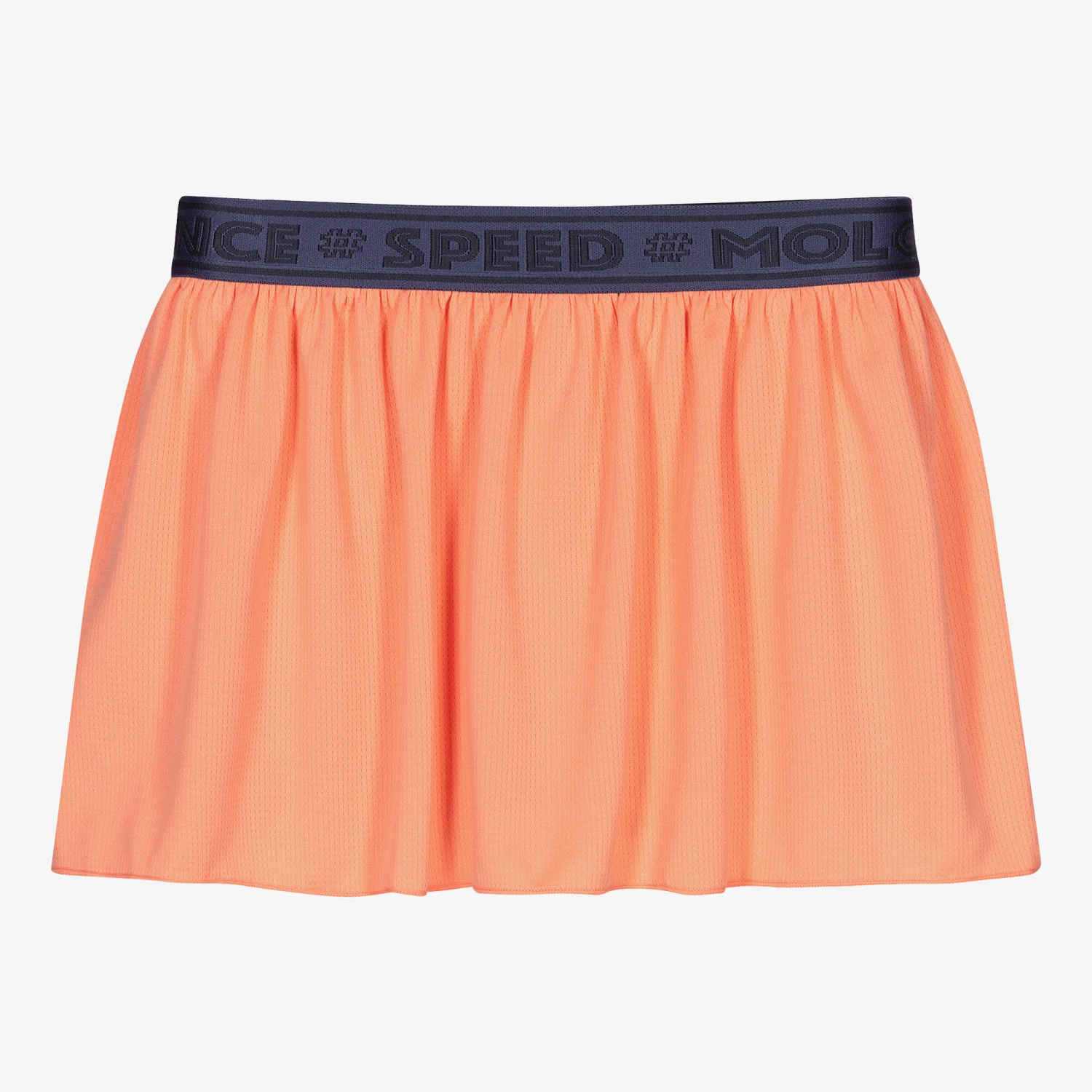 Bright coral pink skort for teen girls by Molo, made from silky, stretchy technical polyester. Designed to keep you cool, it has a grey blue sporty slogan and logo jacquard waistband, and internal, orange stretchy shorts, ideal for sports.
