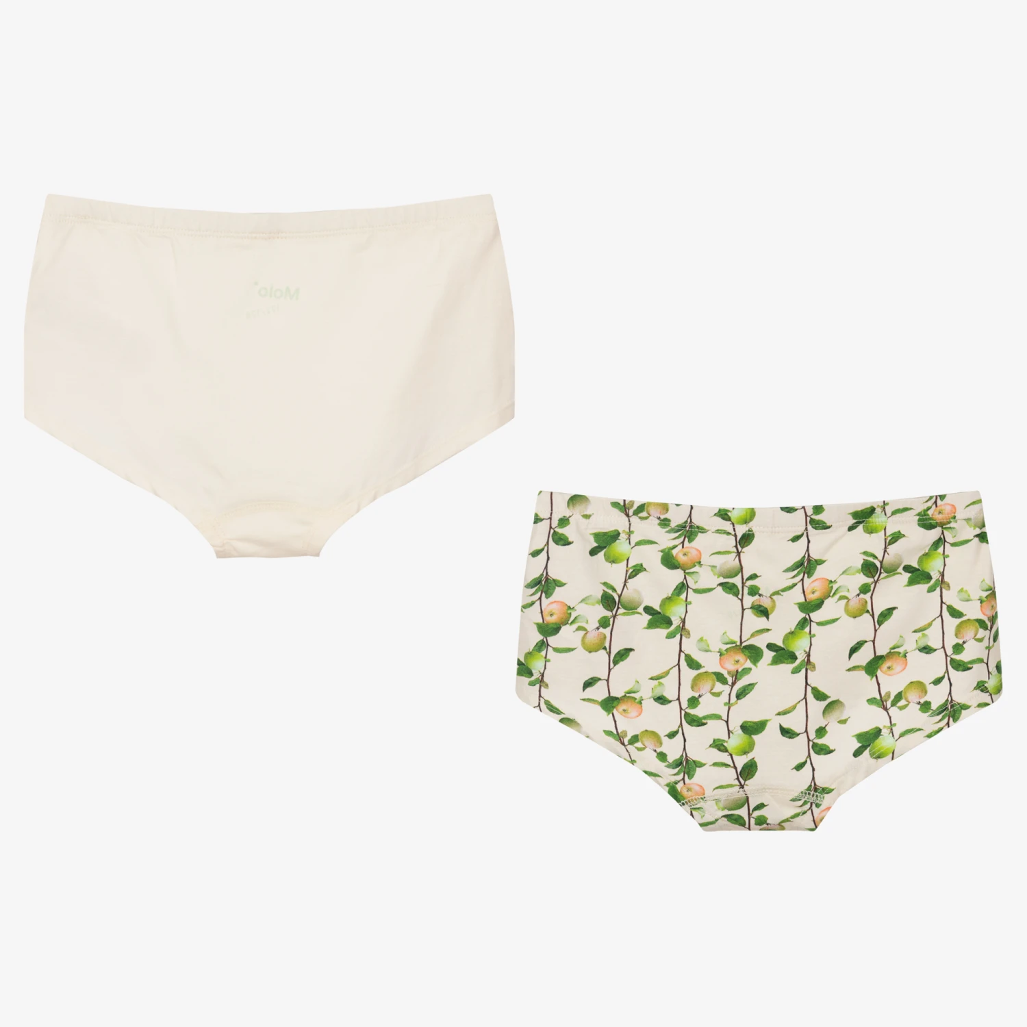 Two pairs of knickers for teen girls from Danish brand Molo, made in super soft organic cotton jersey for comfortable wear. Both pairs have elasticated waistbands and come in different designs. One is plain ivory, while the other is light beige with a green and pink apple print.