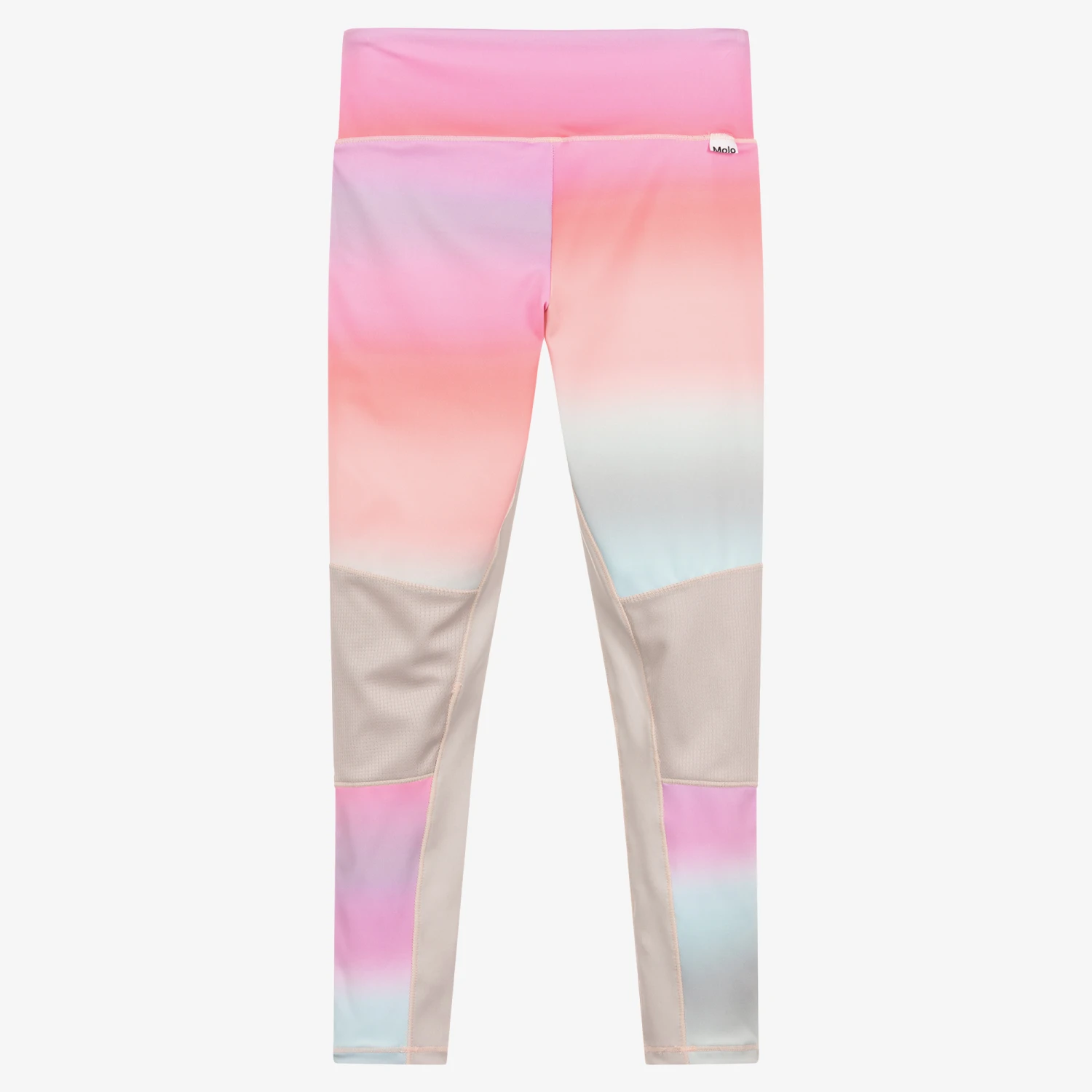 Combining sports with fashion, these activewear leggings for teen girls are by Molo. Full length, they have a pink and blue ombré effect, with beige panels on the knees, and lilac purple logo tape down the sides. Made in silky soft technical jersey using HeiQ Smart Temp, they support the body’s own ability to cool down, ensuring optimal comfort and performance. A branded tab on the back adds a finishing designer touch.