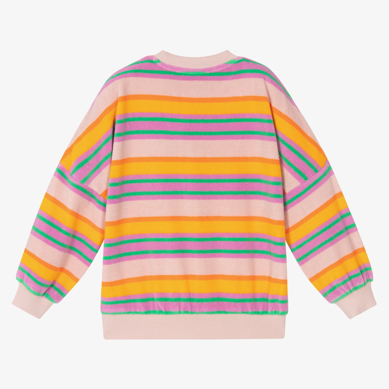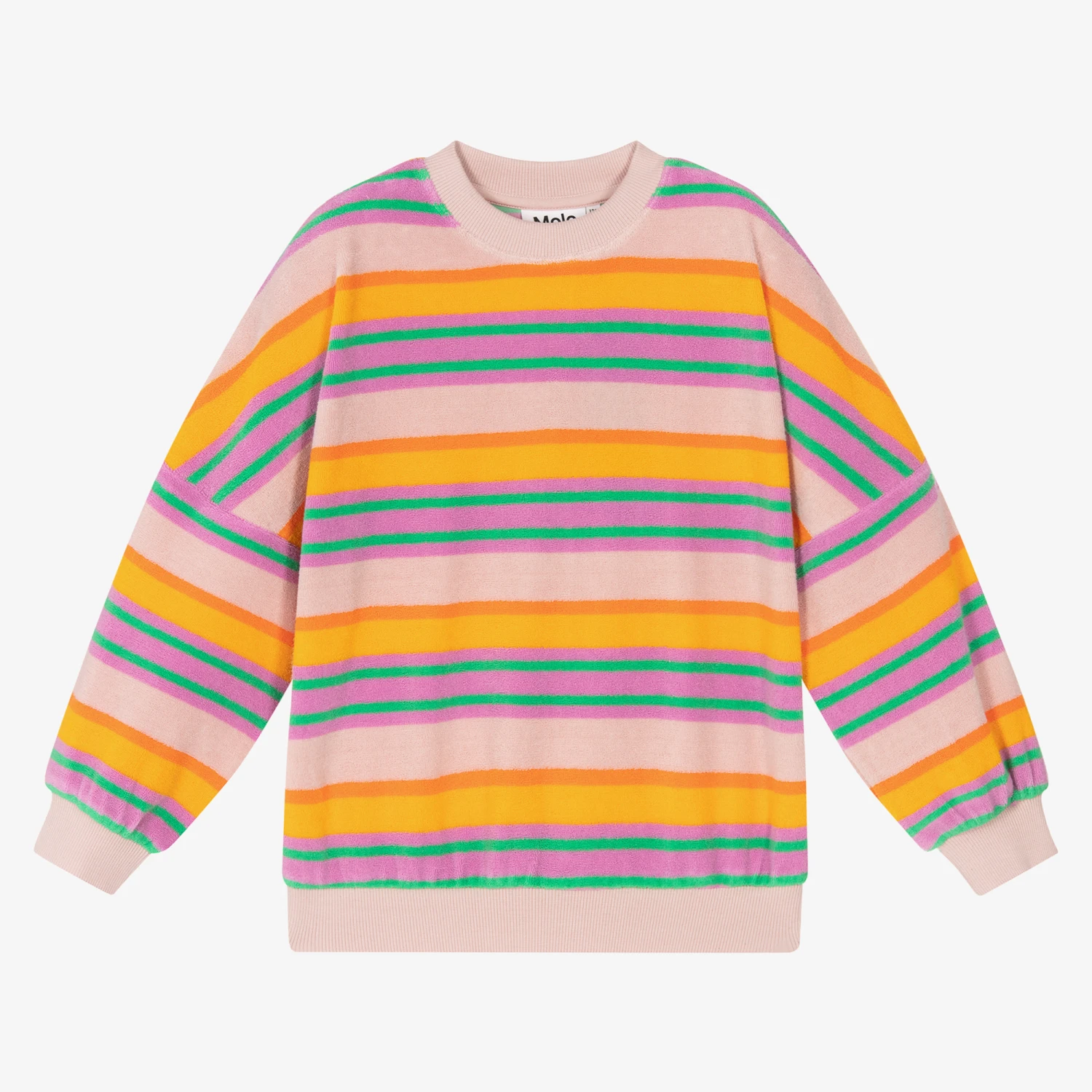 Super cute pink towelling sweatshirt for teen girls by Molo, with orange, purple, and green stripes. Made in cotton fabric, it has ribbed trims for a comfortable laid-back look.