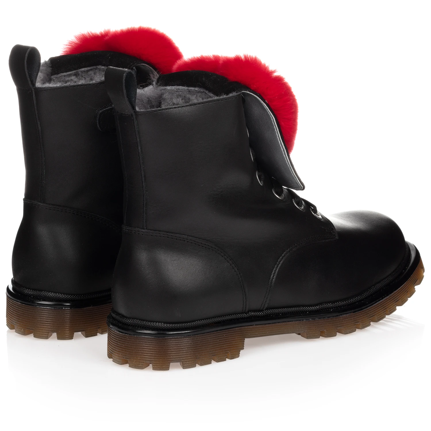 Teen girls black leather Monnalisa boots. They have a black suede flap on the front with large red fur heart shape. Comfortable to wear, they have a soft sheepskin lining. The side zip allows the laces to remain neatly tied and they have a chunky non-slip sole.