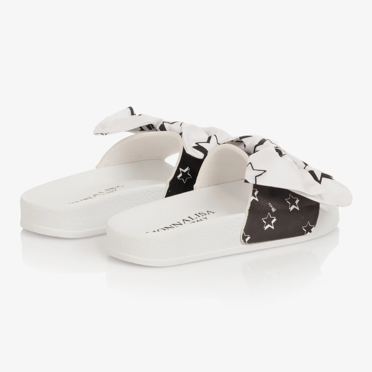 Black and white sliders for teen girls by Monnalisa, trimmed with a statement bow with a black star print. There is a wide black foot strap with a matching monochrome star pattern and soft textile lining. The moulded footbed and soles are made in soft rubber.
