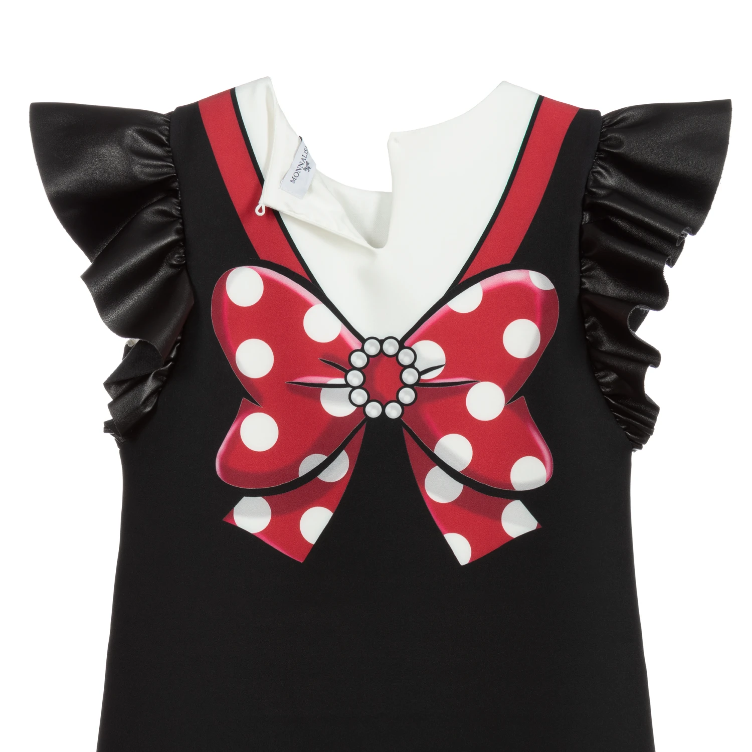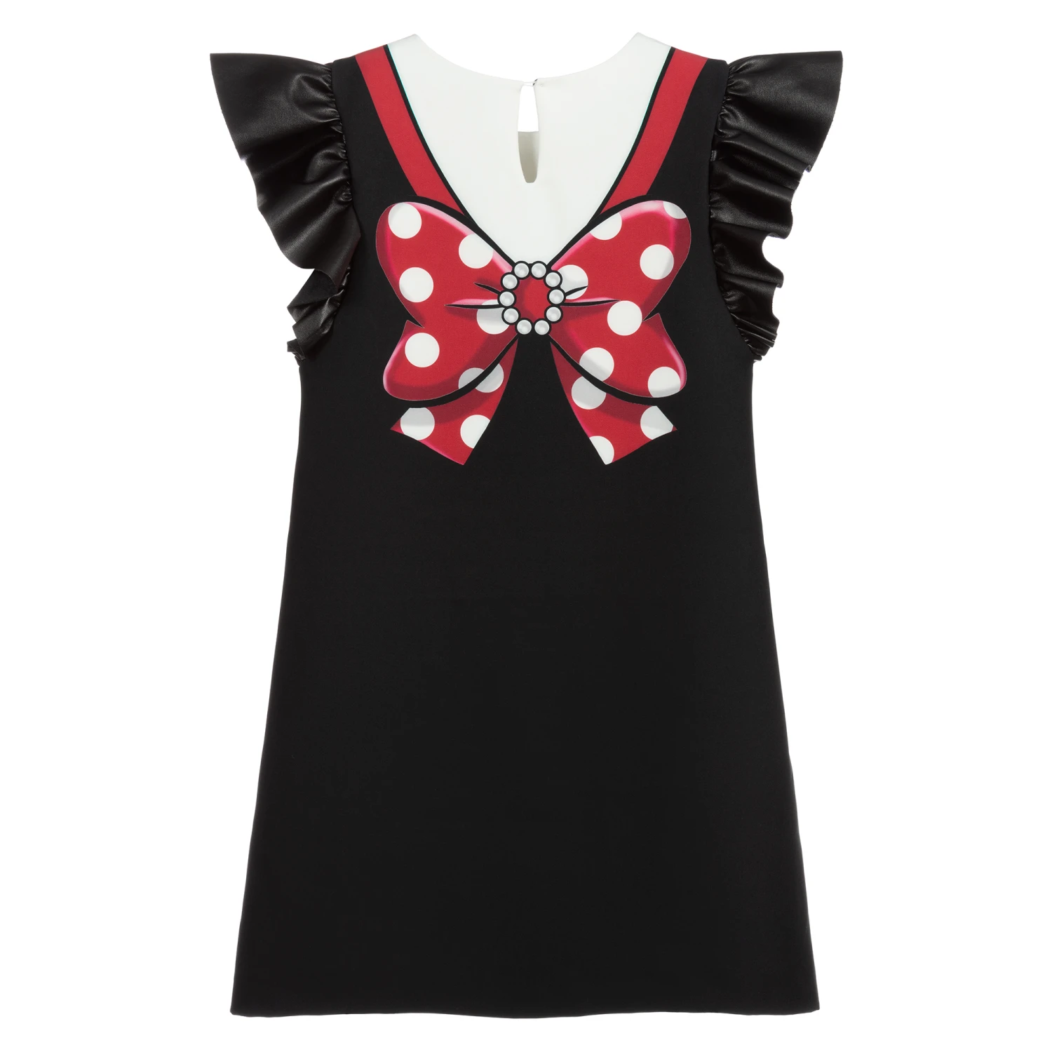 Black and white mini dress for teen girls by Monnalisa, made in stretchy jersey. It has faux leather ruffle sleeves and an Olive Oyl print from Popeye on the front, with a large printed bow on the back.