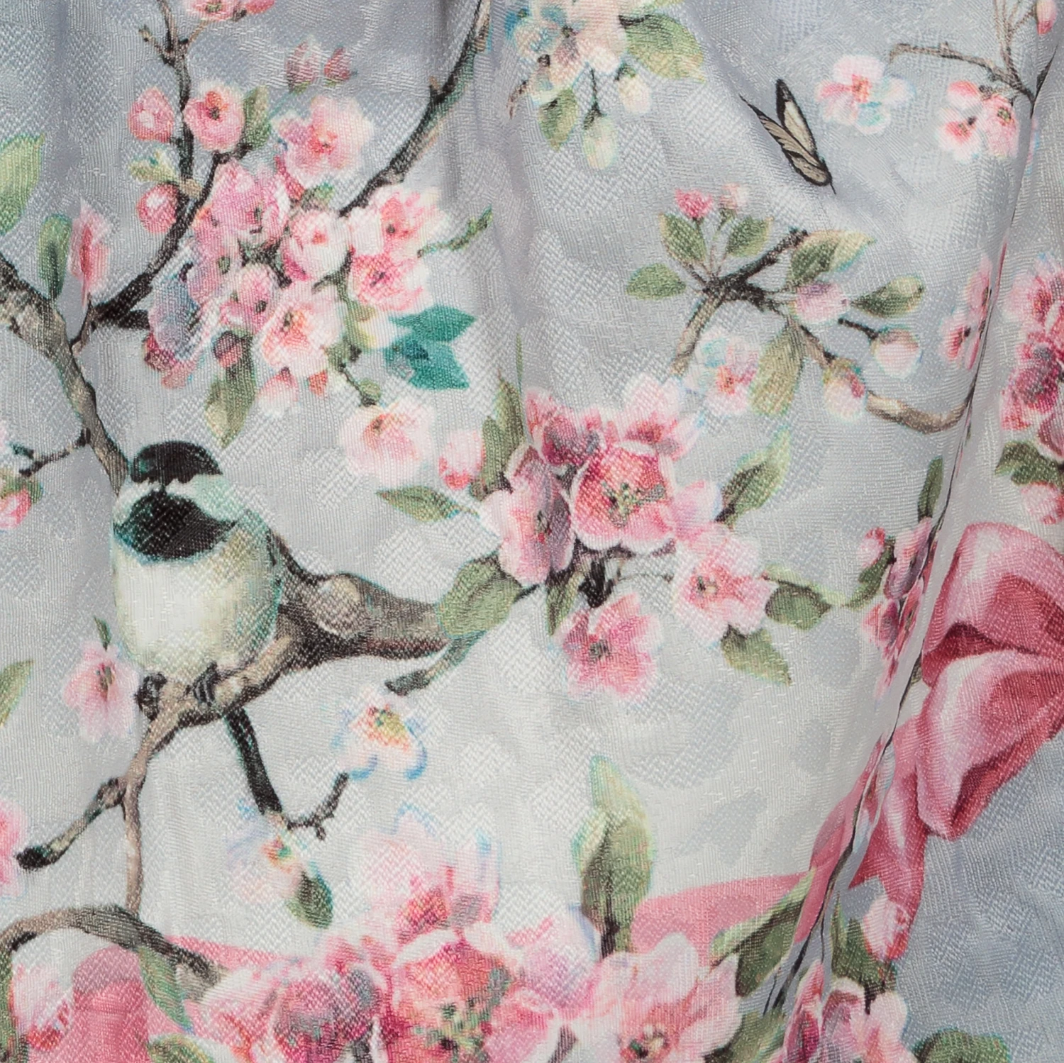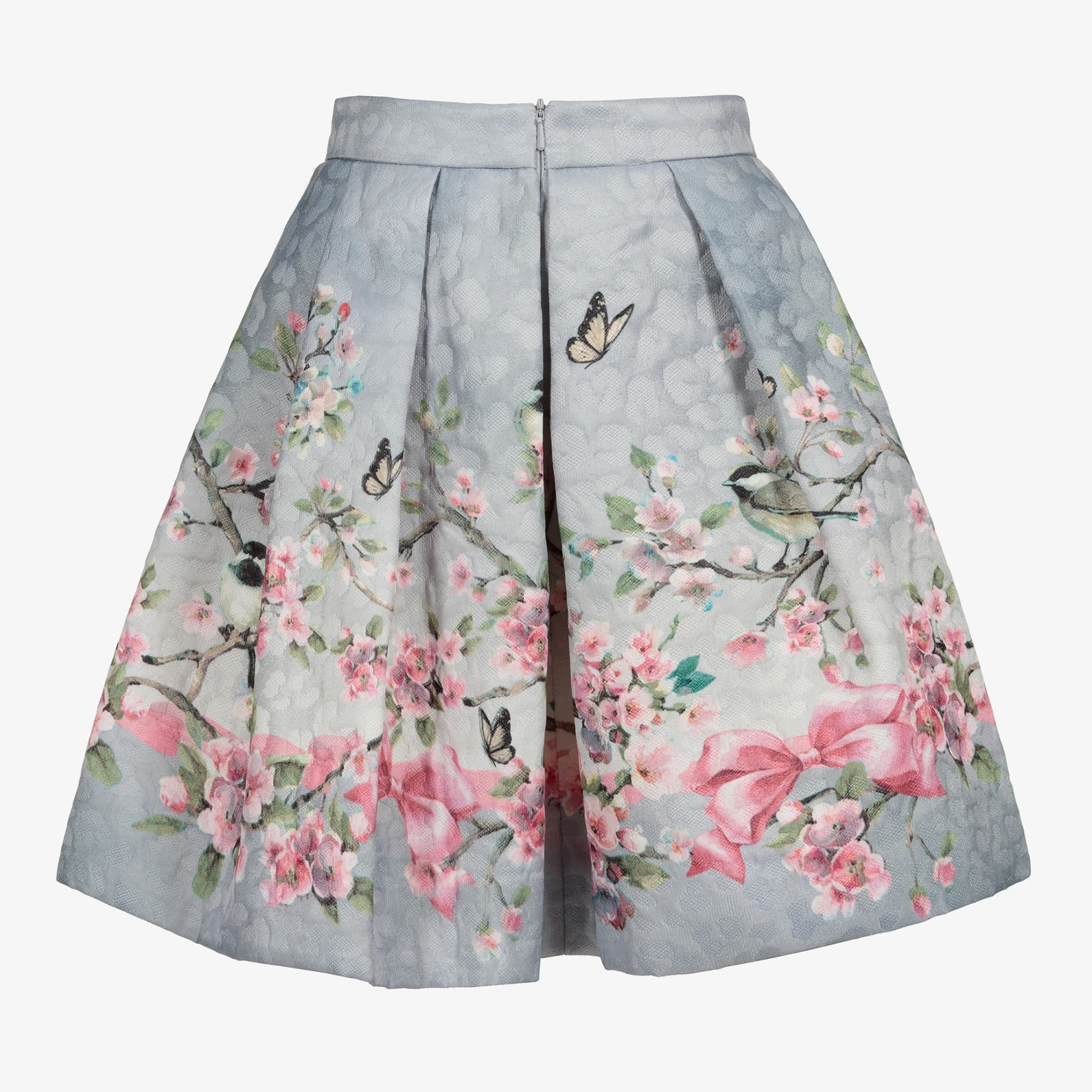 Grey and pink floral skirt for teen girls by Monnalisa, with a delicate cherry blossom flower and bird print, for those wanting to make a statement. Made with soft twill, it has an elegant full-circle shape. It is lined with a soft viscose and cotton blend and layers of tulle for volume. It fastens with a zip on the back, and has a useful adjustable waist.