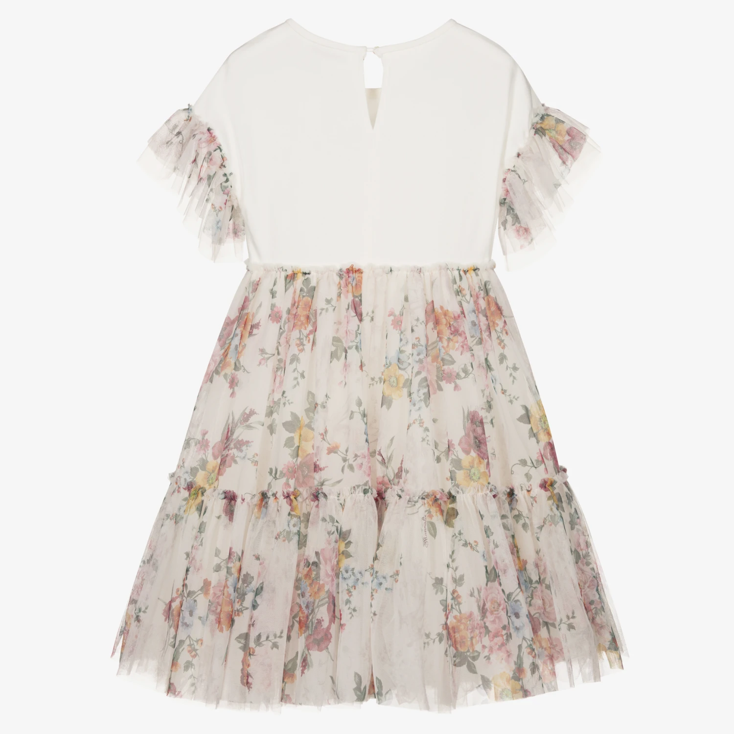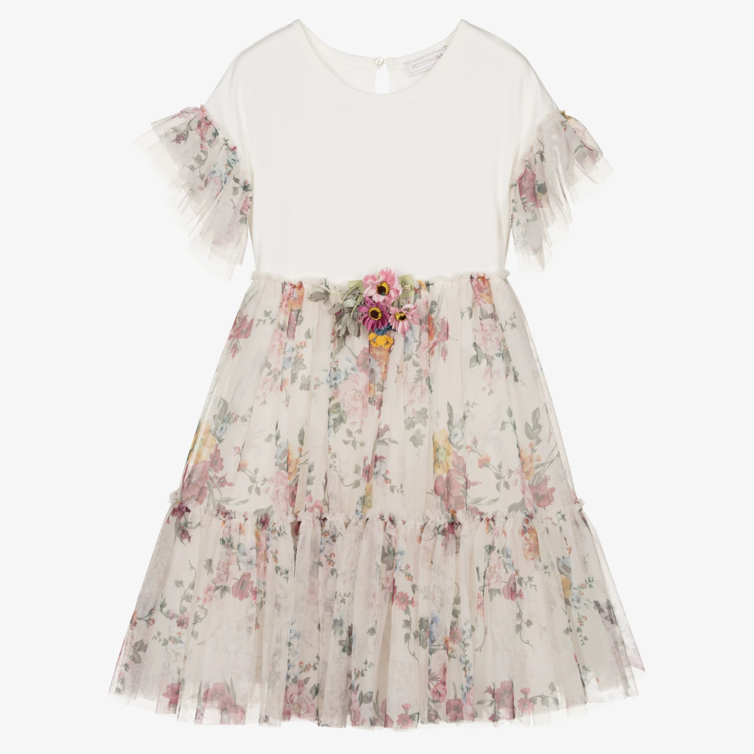 Gorgeous viscose ivory dress for teen girls by Italian brand Monnalisa. The super soft jersey bodice is comfortable to wear and has colourful floral tulle ruffles over the shoulders for stand out style. The layered tulle skirt has a matching branded floral and Toile de Jouy print, with a cool, lightweight cotton lining. There is a detachable floral corsage positioned on the waist, and a single button fastening on the back for easy dressing.