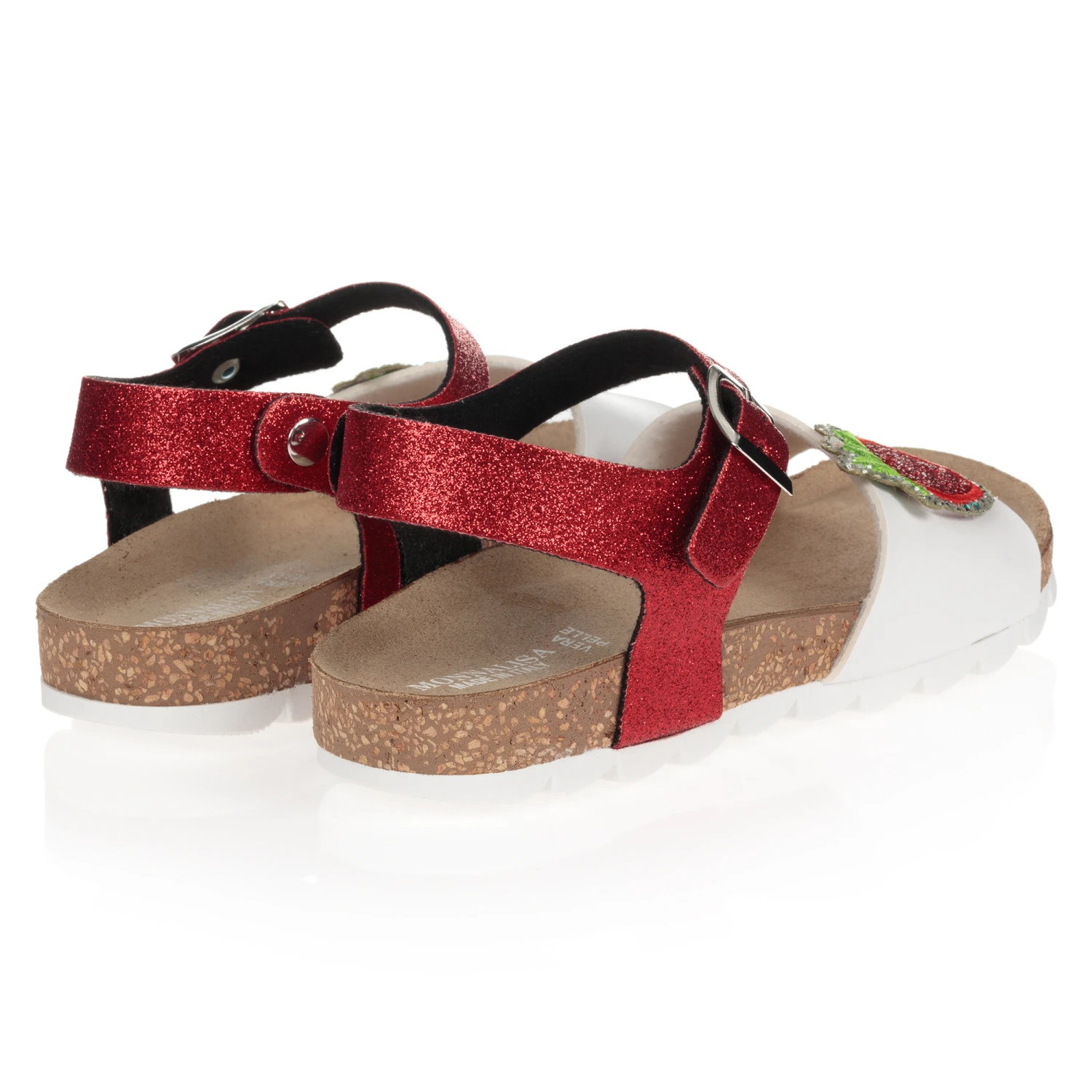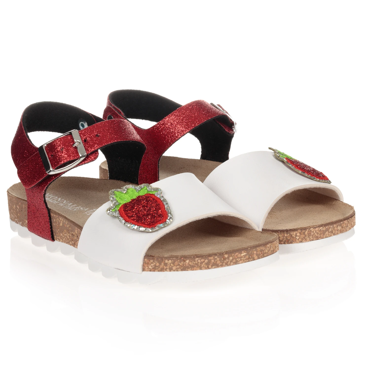 Teen girls white and glittery red sandals by Monnalisa. These sandals combine comfort, such as the adjustable strap and enhanced soles, with glam details such as a strawberry patch and glitter. They have silver metal buckle fastening and moulded leather insoles.
