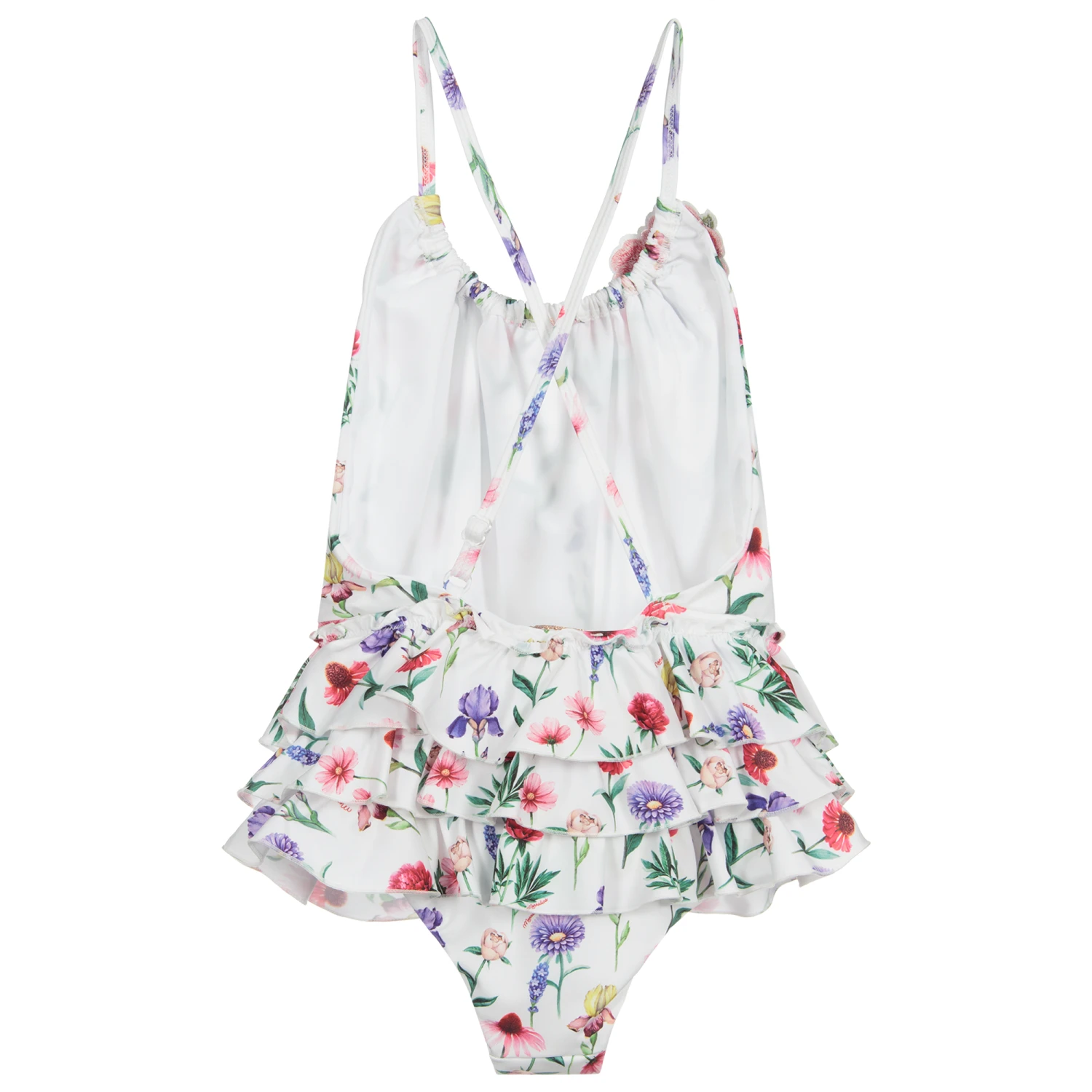 Teen girls white swimsuit by Monnalisa. It has a pink, purple and yellow floral logo print, for a little extra designer touch. Soft and stretchy, it has an embroidered and beaded rose on the front. Fully lined, there are adjustable shoulder straps and ruffle trim.