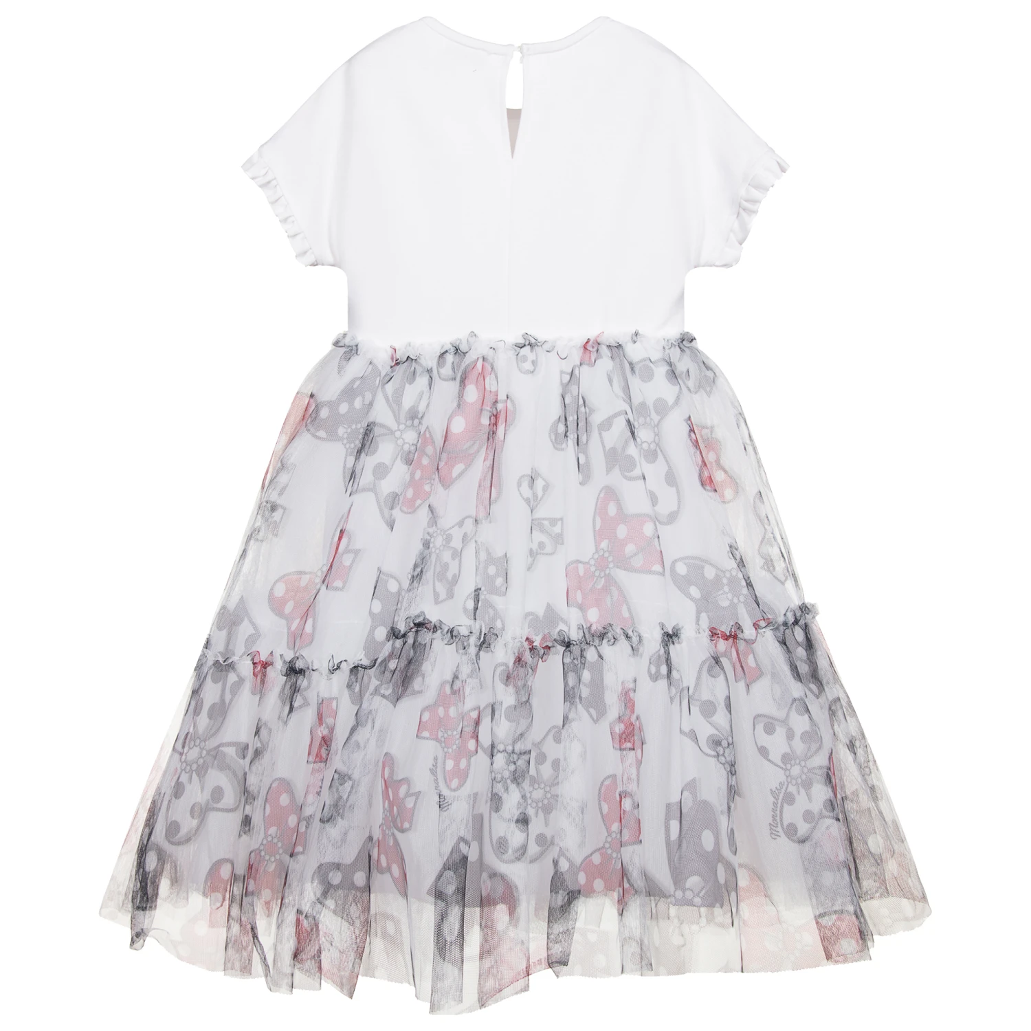Teen girls white dress by Monnalisa, with a tiered tulle skirt that has a red and black bow pattern. The bodice is made in soft jersey, with a removable heart and bow appliqué on the waist. It has a lightweight cotton lining and back button fastening.
