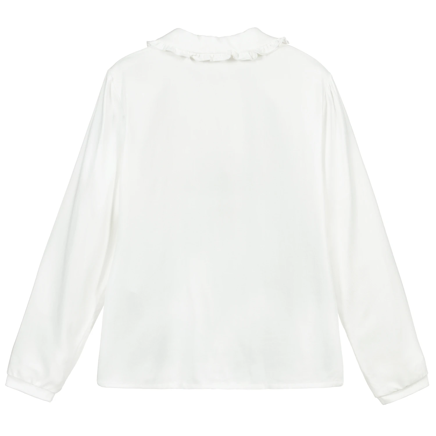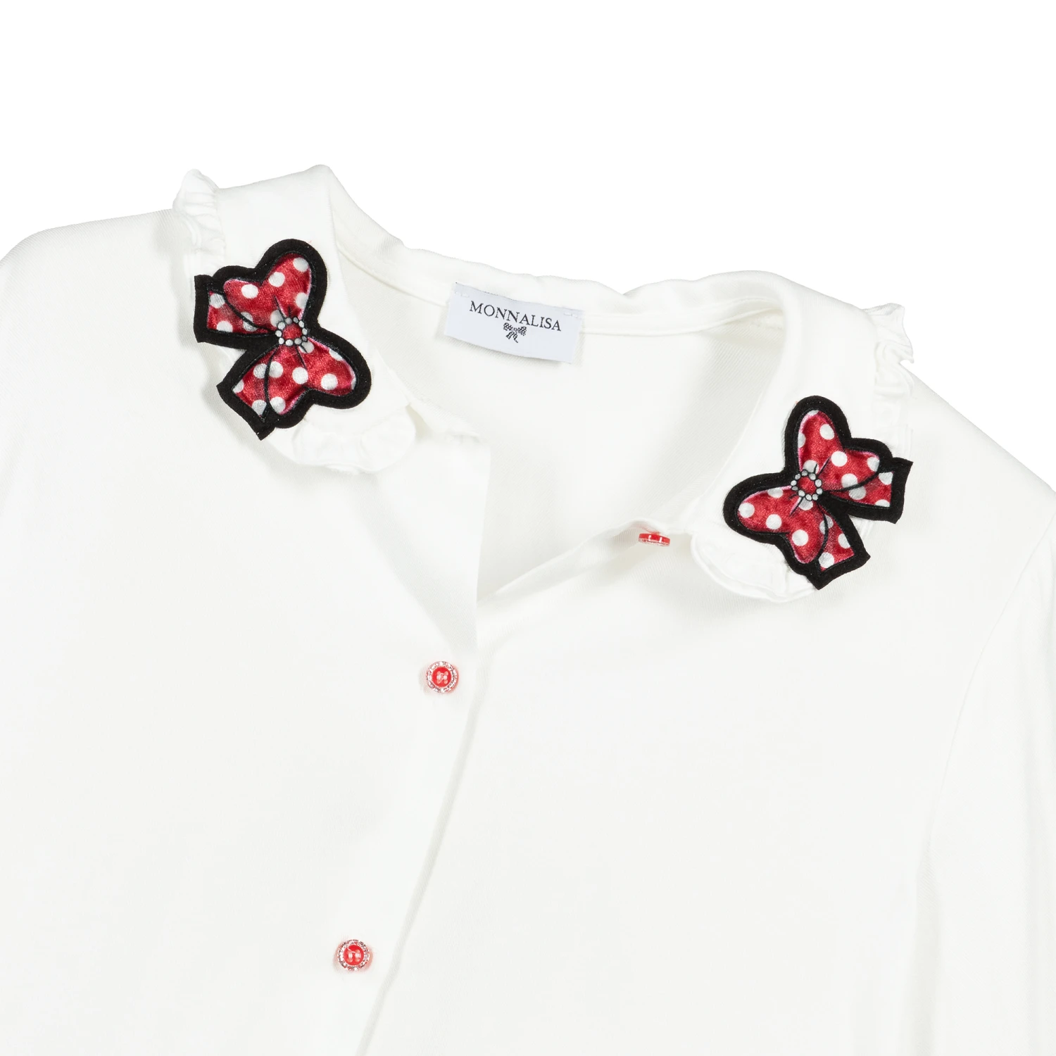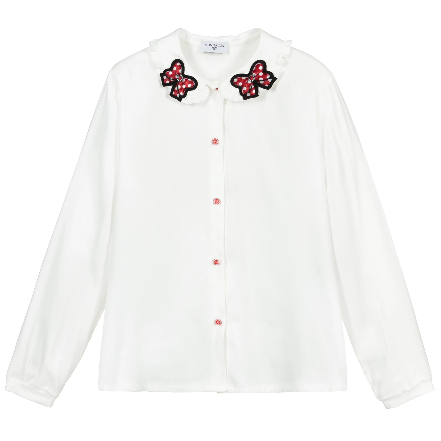 A beautifully soft white viscose blouse for teen girls by Monnalisa. It has a rounded collar with frilled trim and red, black and white polka dot bow appliqués. The button fastenings on the front are red with sparkly silver glitter. The cuffs are made in ribbed jersey.