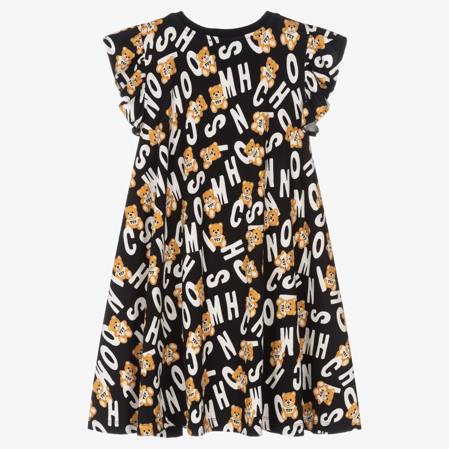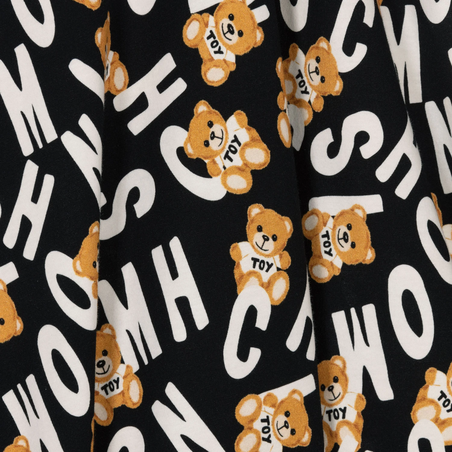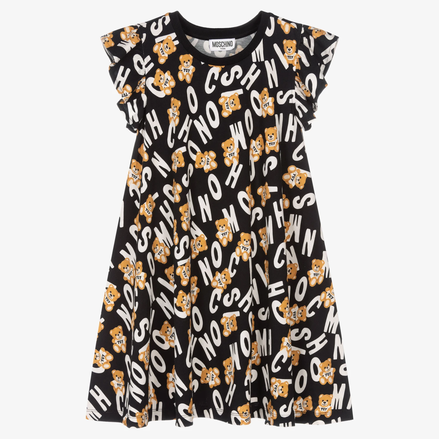 Teen girls black and white dress by Moschino Kid-Teen, in a monochromatic T-shirt style. It has an all-over Moschino Teddy Bear logo print for an instantly recognisable look. Ideal for casual days, it has flutter sleeves and is made in soft, relaxed cotton jersey.