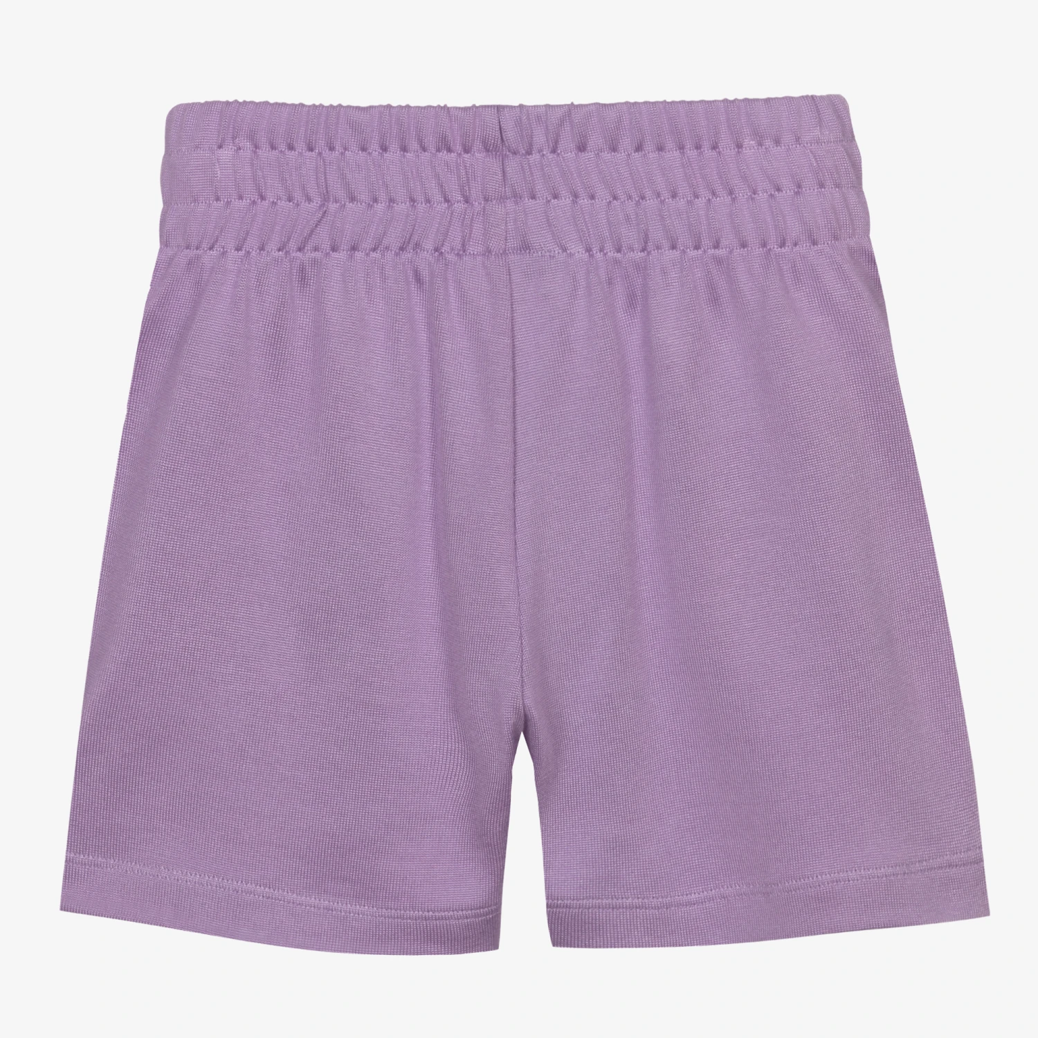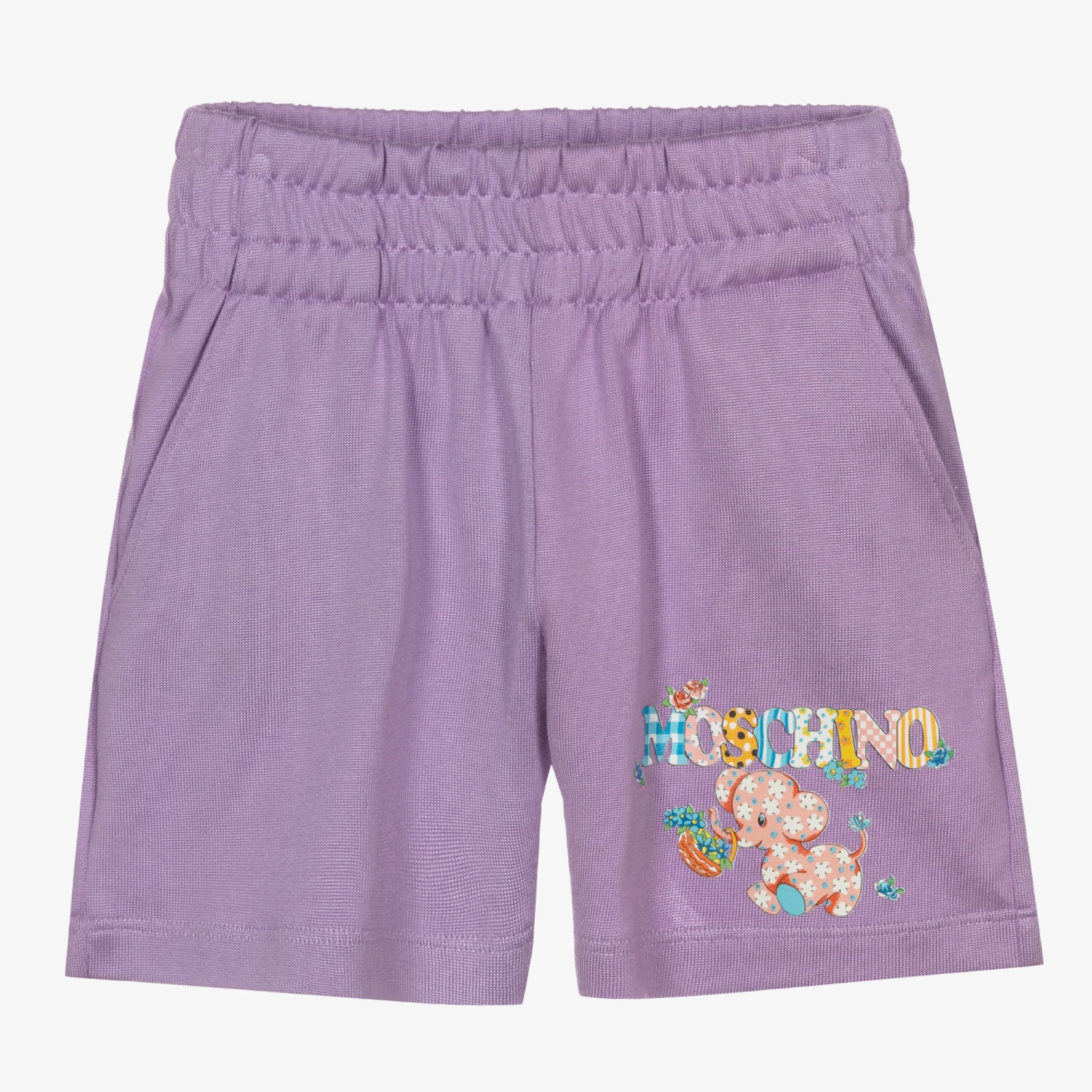 Lilac purple shorts for teen girls by Moschino Kid-Teen, made in a soft, stretchy cotton and viscose blend jersey. Inspired by the adult collection, these casual shorts have a sporty sheen and a vintage-style floral baby elephant and logo print on the front. There are front pockets and an elasticated waist.