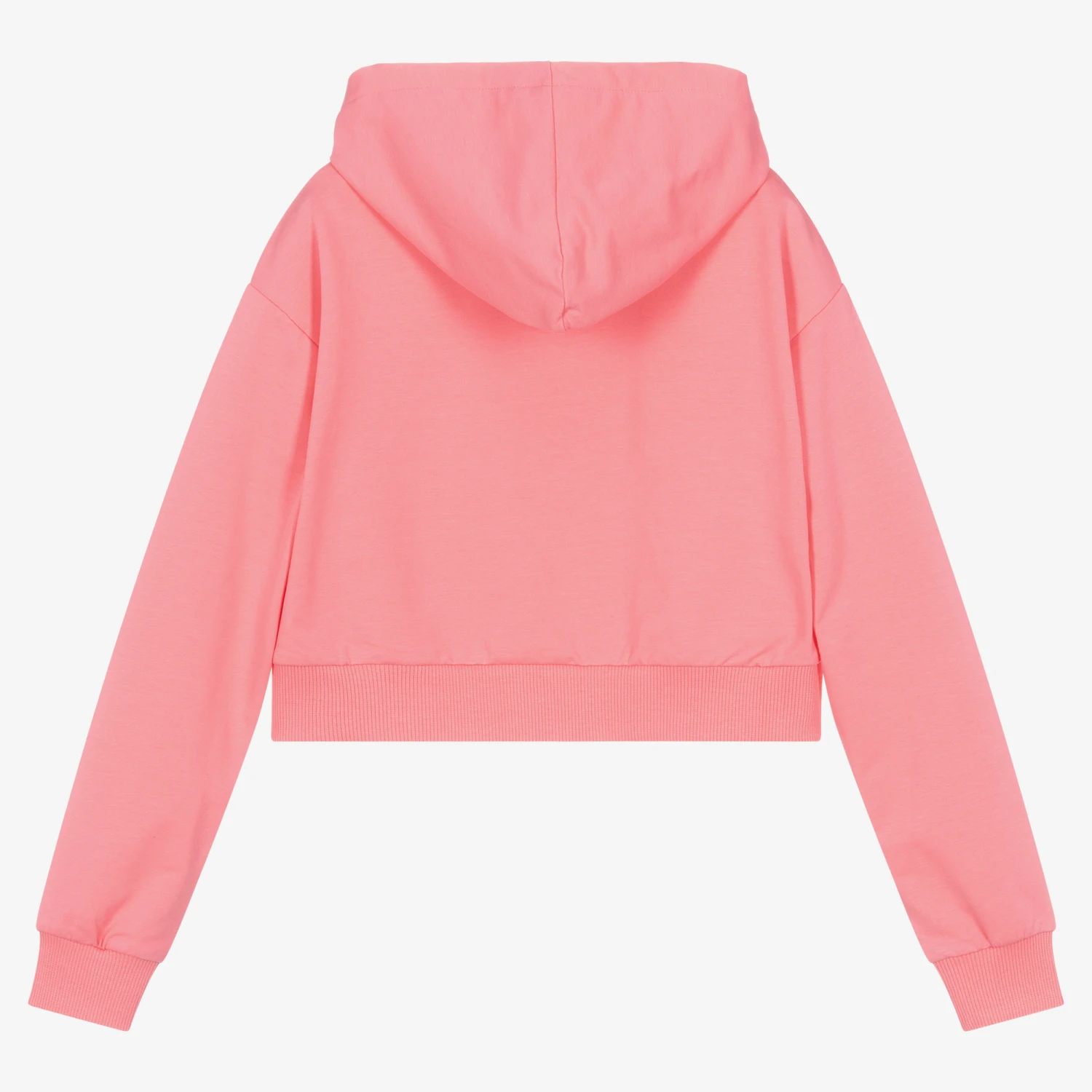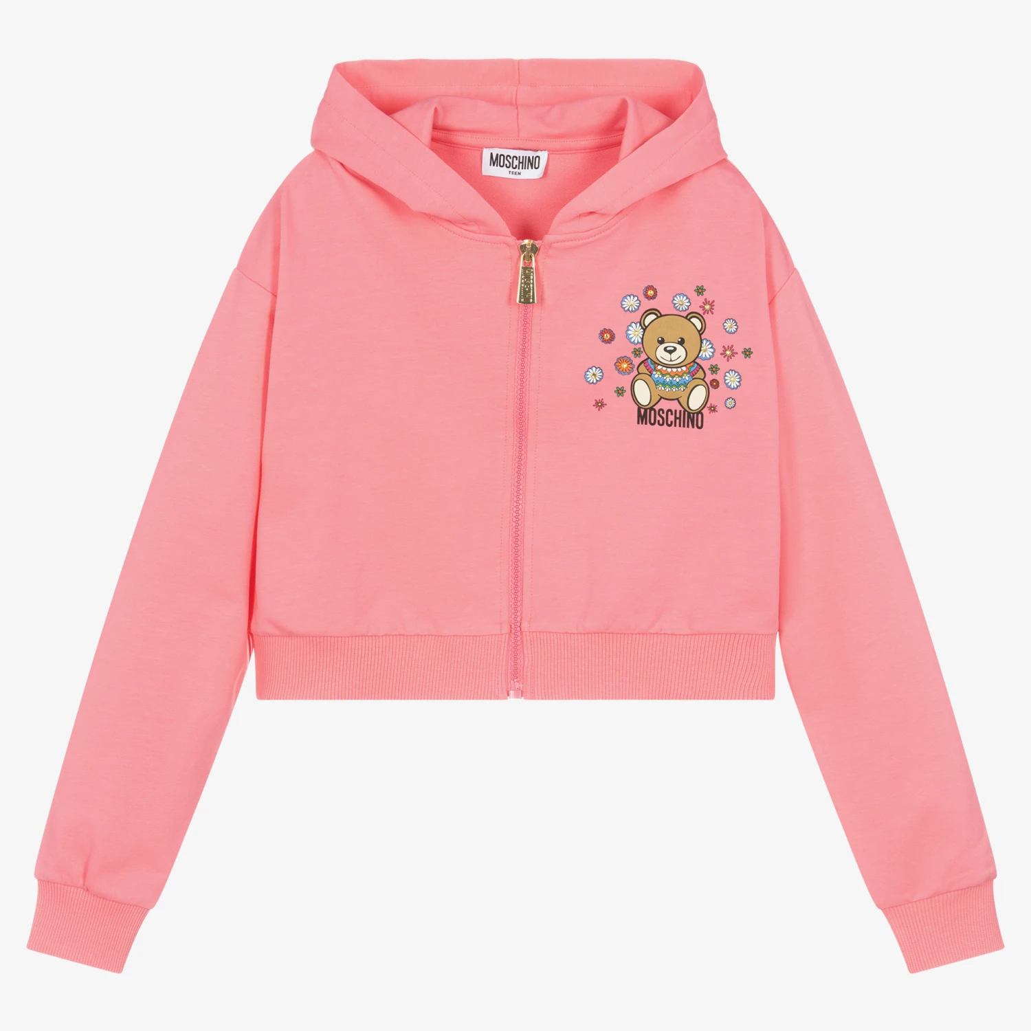 Pink hooded zip-up top for teen girls by luxury Italian designer Moschino Kid-Teen, made in lightweight cotton. It has an eye-catching, colourful Moschino Teddy Bear logo and floral print on the front, sparkling with rhinestones. Made in comfortable jersey with ribbed cuffs, it has an exposed front zip with a golden logo pull tab.