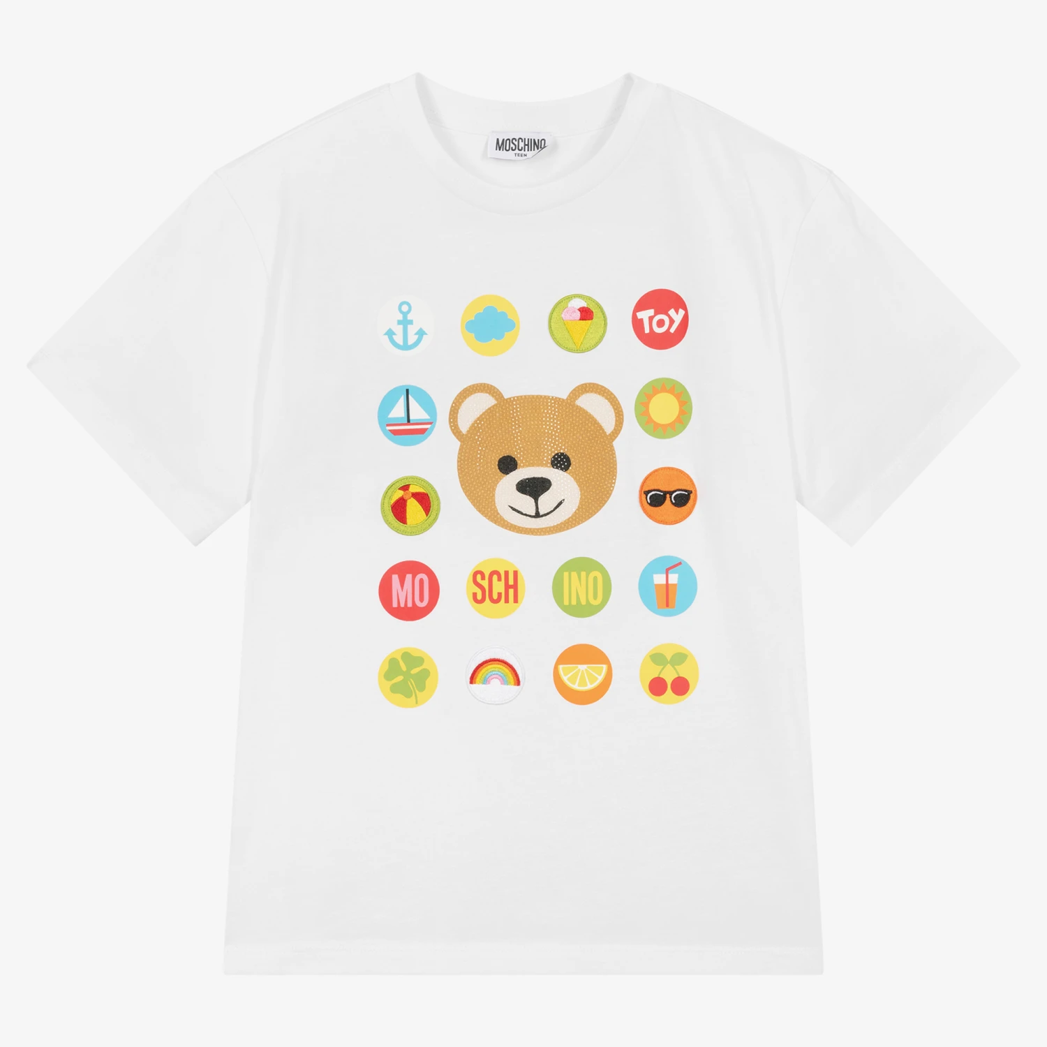 White cotton T-shirt for teen girls by Moschino Kid-Teen, made in comfortable jersey with an oversized fit. It is printed on the front with the luxury Italian designer’s signature Moschino Teddy Bear, embellished with sparkling crystals. To complete the playful look, it has holiday-inspired appliqués and prints for a pop of colour.