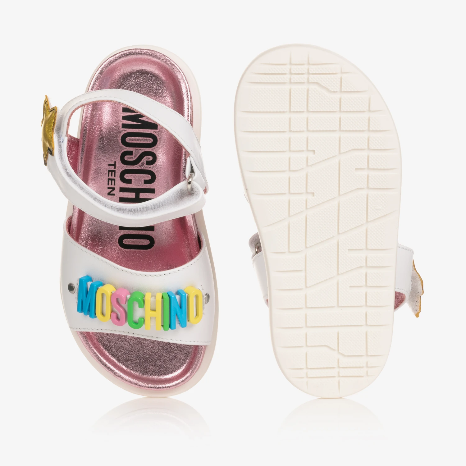 Teen girls white leather open-toe sandals by Moschino Kid-Teen. In pastel rainbow shades, the brand’s metal logo decorates the foot strap. The white ankle strap is detailed with a shimmering gold star on the side. Crafted in Italy, these cool shoes have a metallic pink leather insole and non-slip rubber outer sole.