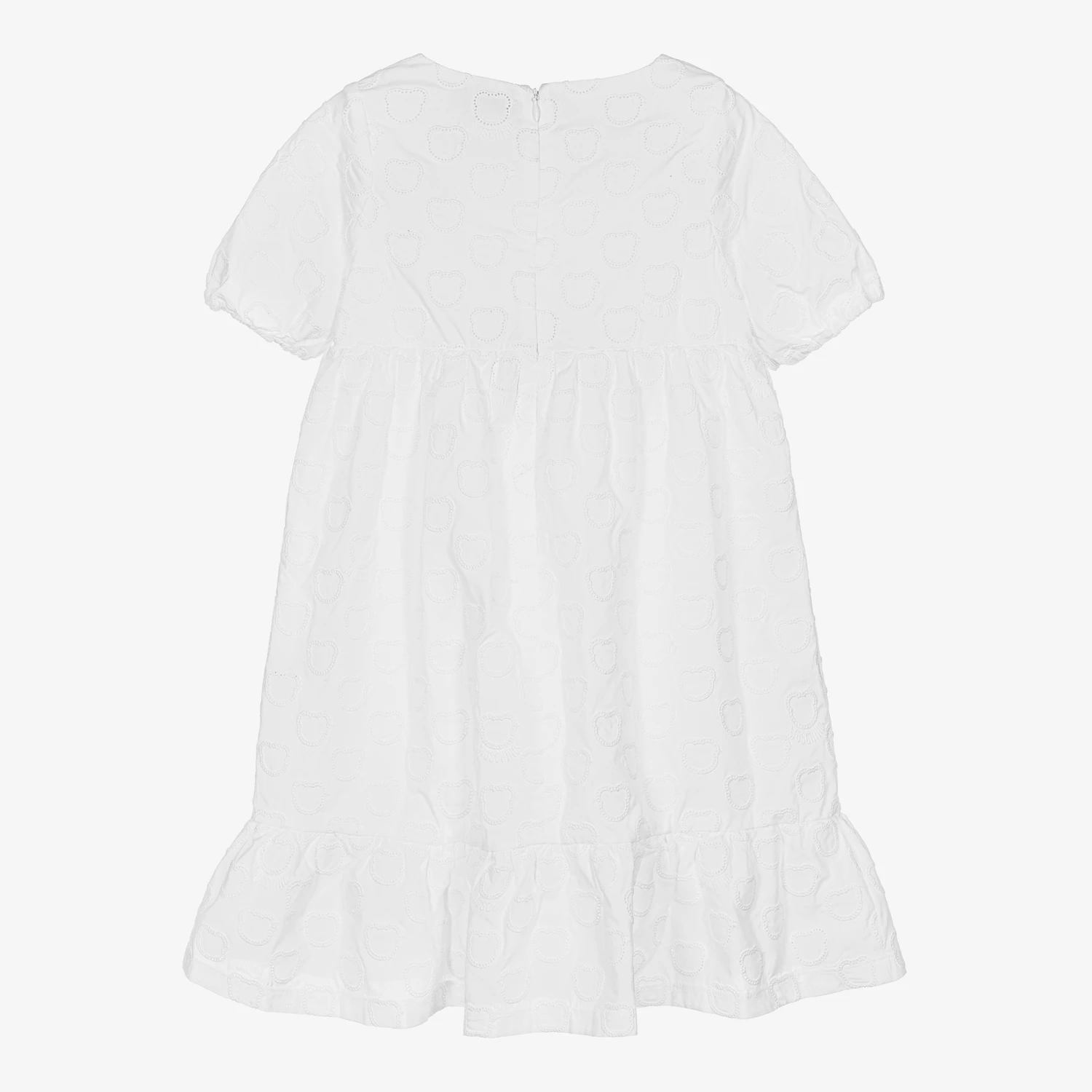 Gorgeous white summer dress for teen girls, designed by Moschino Kid-Teen. Paying homage to the brand’s instantly recognisable Teddy Bear logo, it has all-over Teddy Bear logo embroidery. In the style of a smock dress, it has chic puffed sleeves and a relaxed tiered skirt. It fastens seamlessly with a concealed zip on the back, not distracting from the simplicity of this lovely summer dress.
