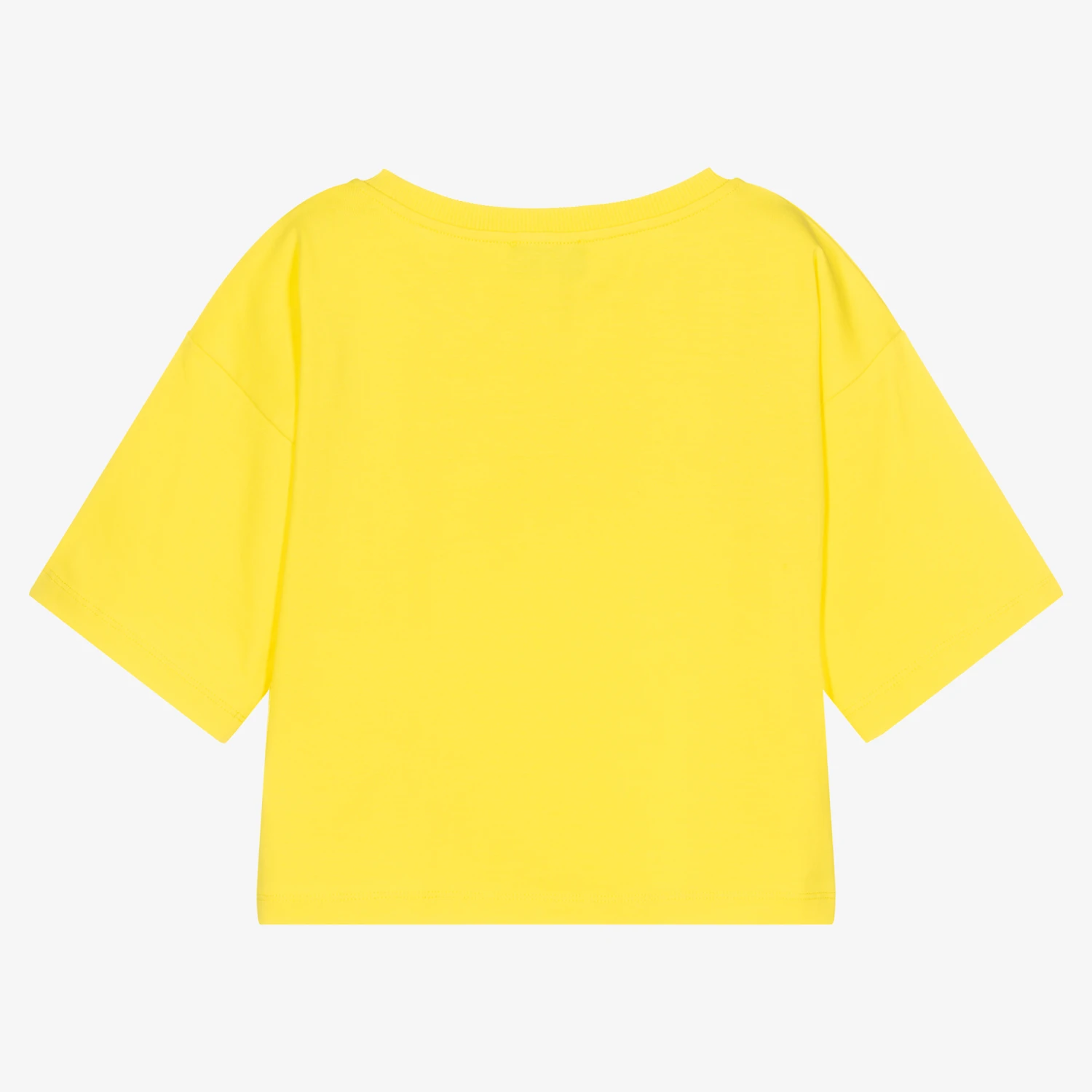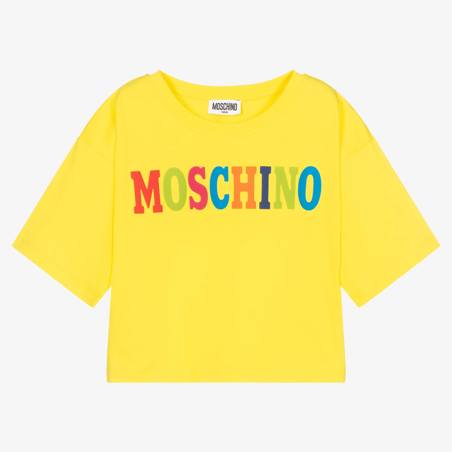 Teen girls yellow T-shirt by Italian luxury designer Moschino Kid-Teen, made in comfortable cotton jersey. As seen in the main collection, it has a colourful flocked logo on the front and cool cropped styling.