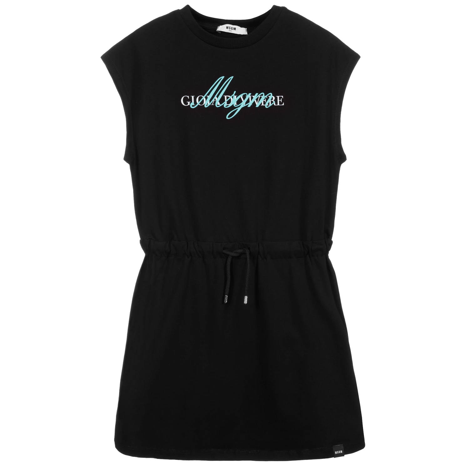 Black jersey dress for teen girls by MSGM, with a drawstring waist and capped sleeves. Invoking a love of the free spirit, the words ‘GIOIA DI VIVERE’ meaning ‘joy of living’ are in white across the chest, intertwined with a blue logo print.
