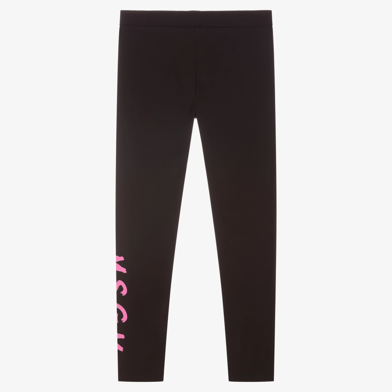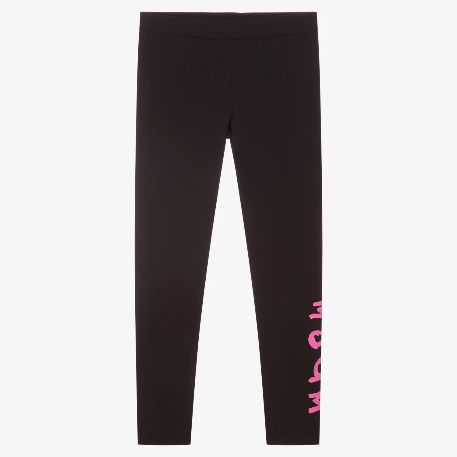 Black cotton leggings for teen girls by Italian designer MSGM. Made in soft and stretchy jersey, the designer’s brushed logo can be found on one leg in fuchsia pink. The waist is elasticated for a comfortable fit.