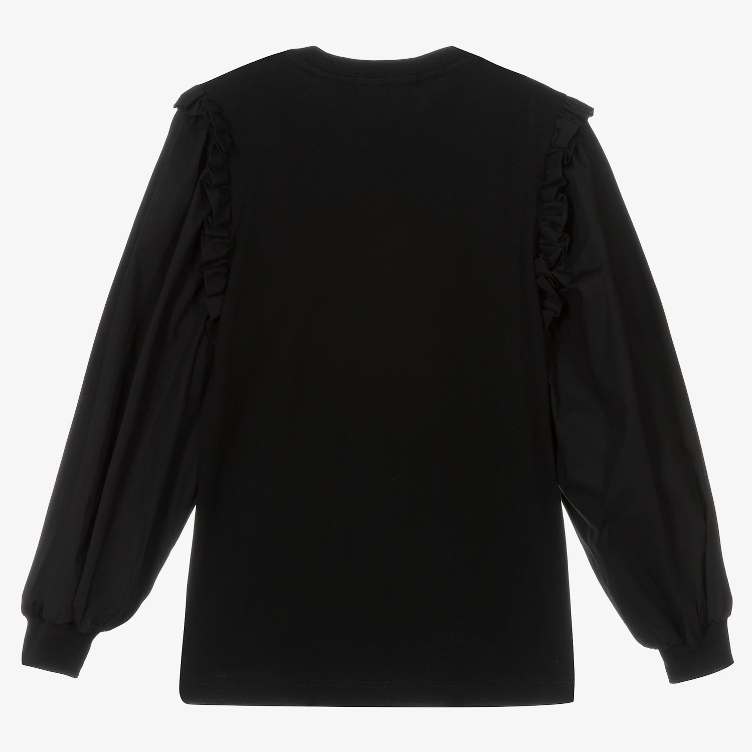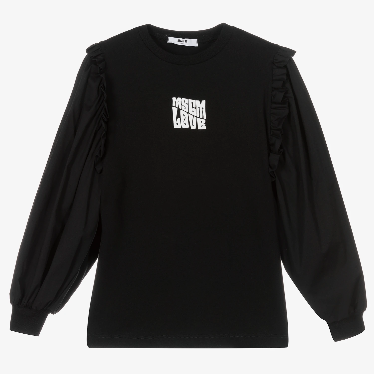 Black cotton top for teen girls by Italian designer MSGM. Made in super soft and stretchy jersey, there are long poplin sleeves with ribbed cuffs to create a slightly puffed effect. This piece has a white ‘MSGM Love’ logo print on the front and ruffles across the shoulders.