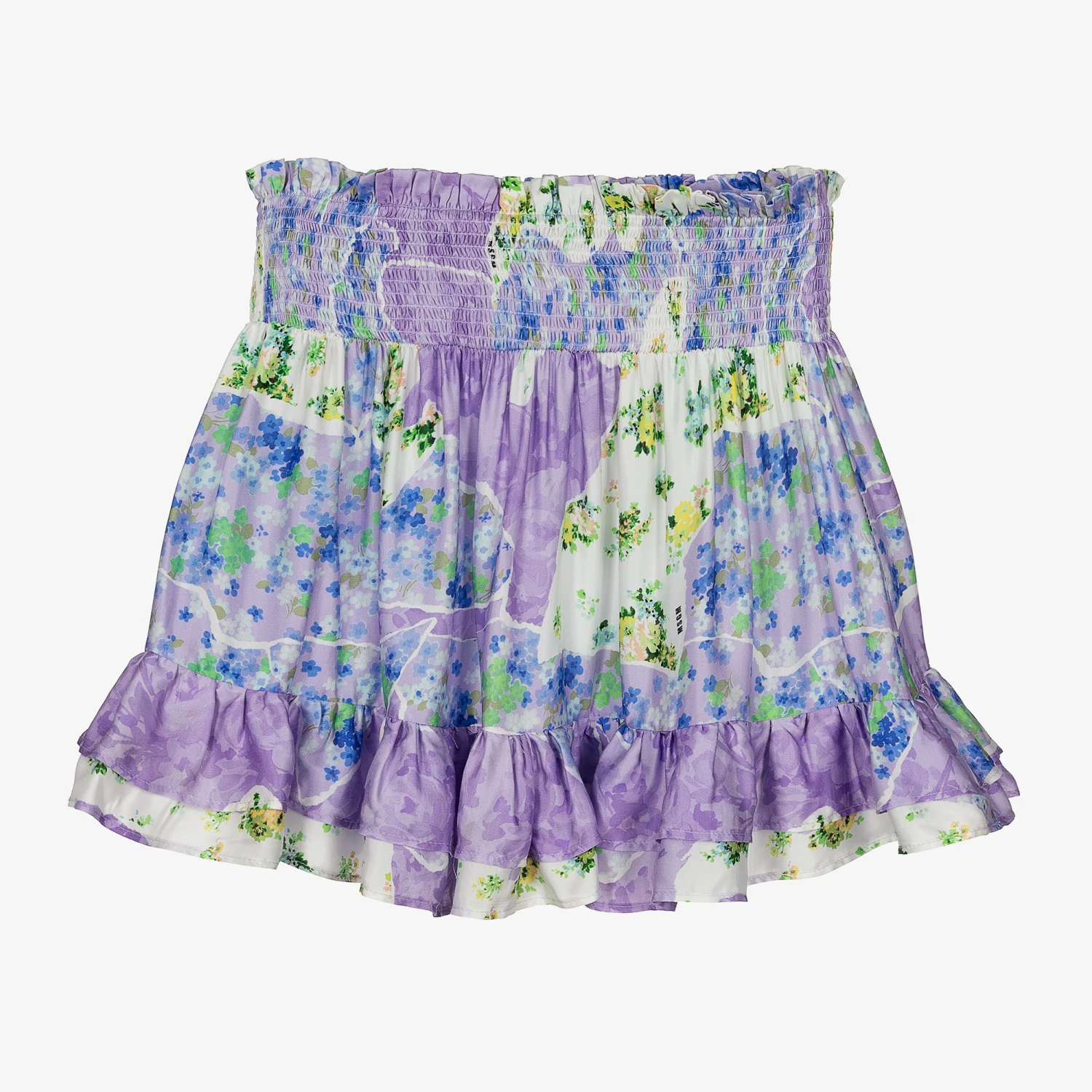 A gorgeous skirt for teen girls by MSGM, patterned in blue, green and yellow florals against a light purple and ivory background. Made in silky soft viscose, it is designed with a subtle black micro logo print and a stretchy shirred waist. The layered ruffles on the hem provide a beautiful shape and full movement.