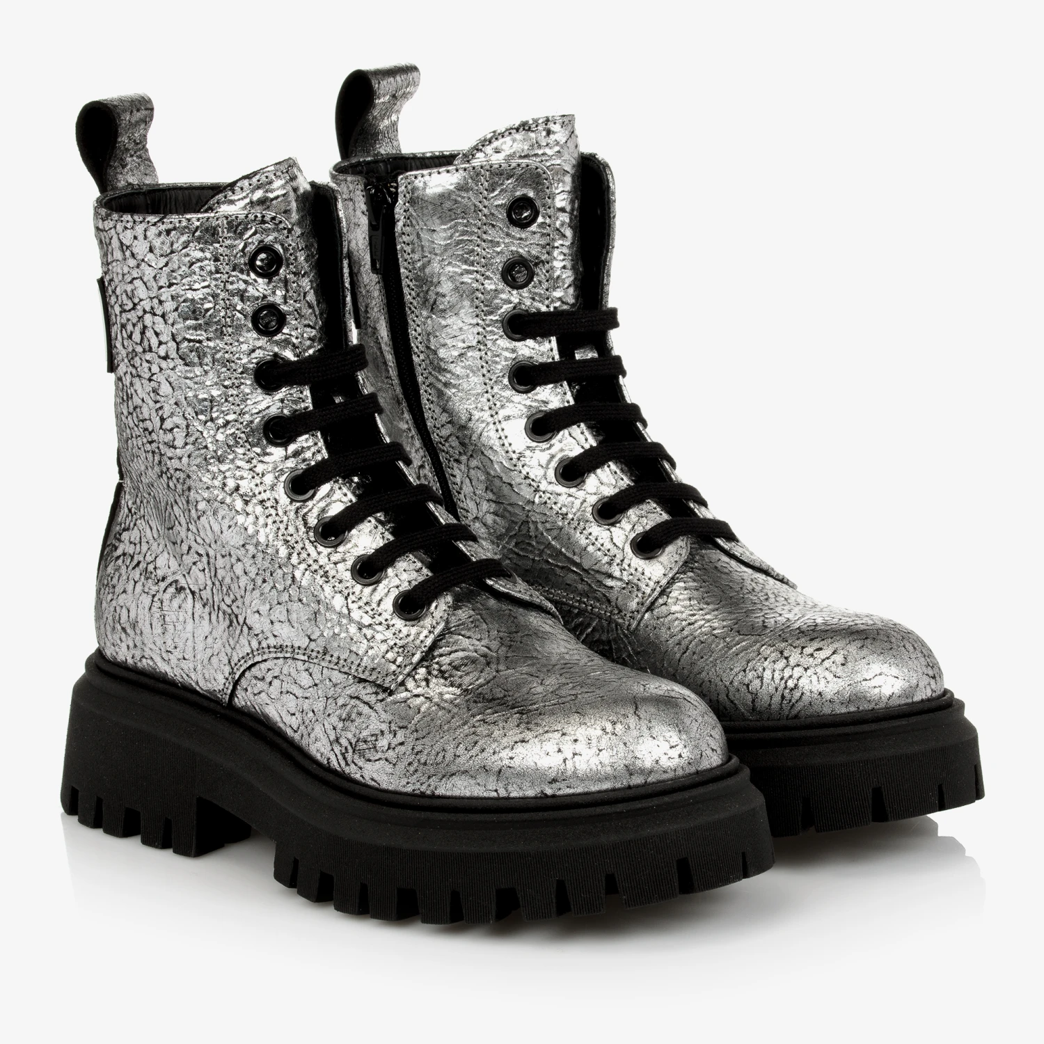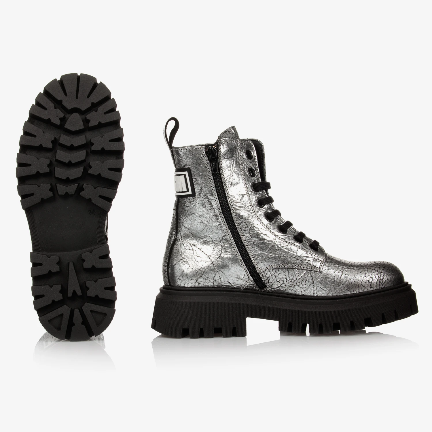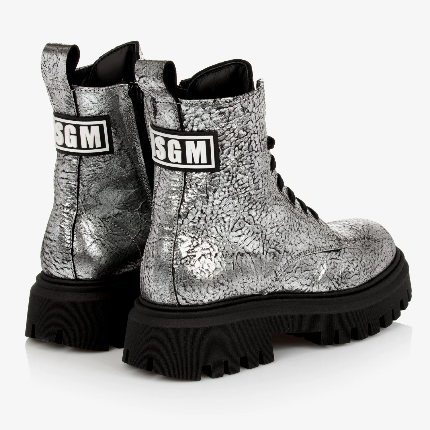Shiny silver boots for teen girls, by MSGM. Made from leather, they have a fun black and white rubber logo on the back, and fasten with black laces and a useful side zip fastening. They have a chunky black non-slip rubber sole with stylish deep treads.