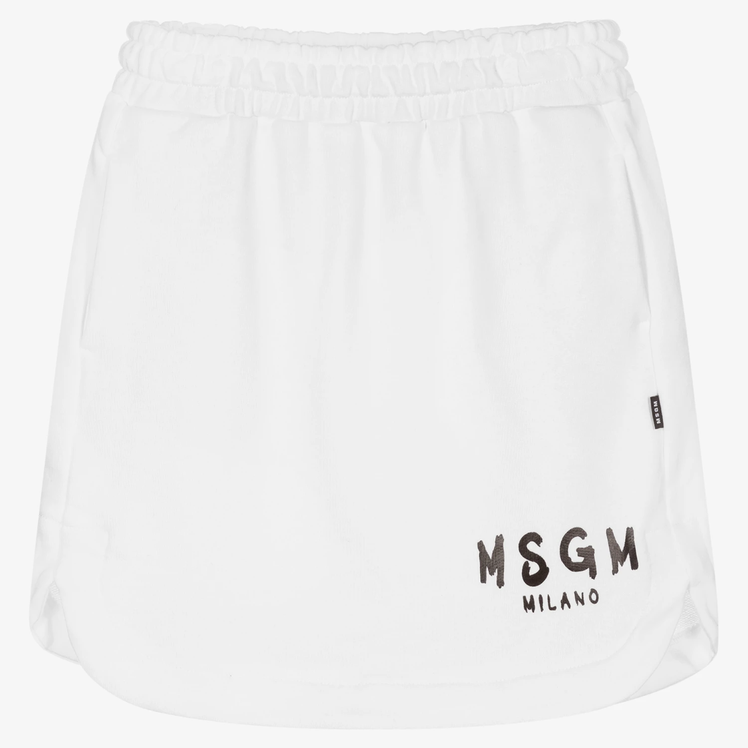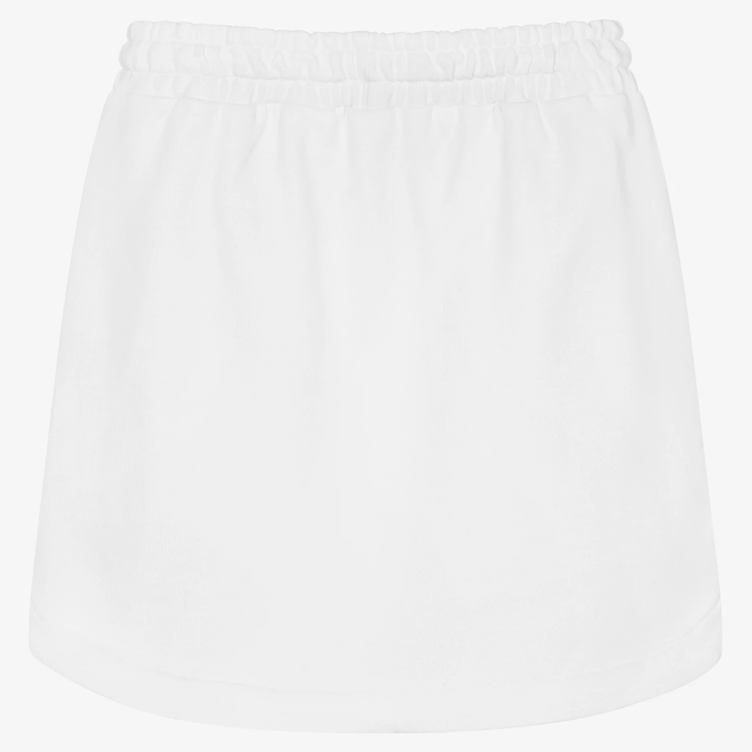 White skirt for teen girls by Italian designer MSGM, with the brand’s brushed logo in black on the front. Made in mid-weight cotton jersey, it has a shaped hem, side pockets and an elasticated waistband.