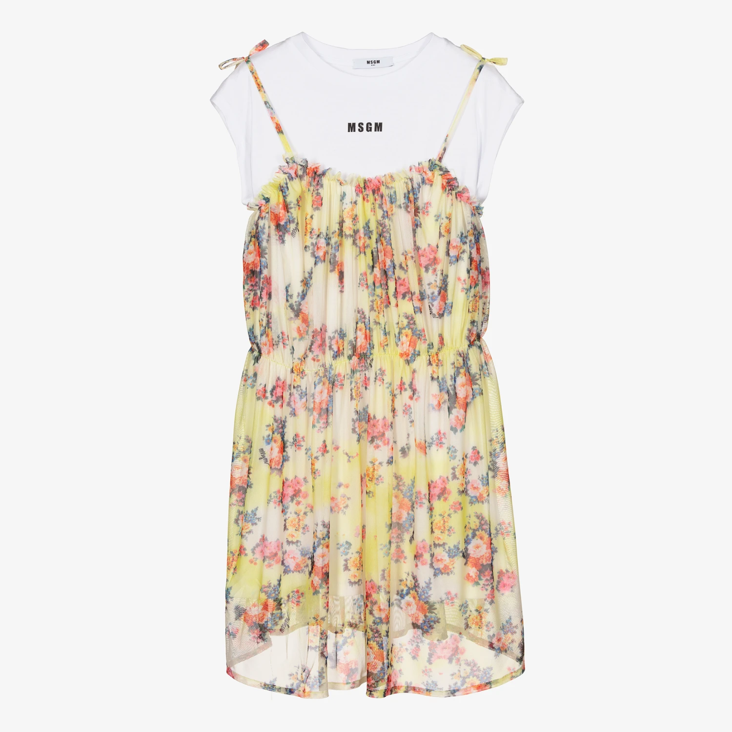 Pretty white and yellow floral 2-in-1 dress by MSGM for teen girls. The floaty yellow floral dress overlay attaches to the main body with fixed shoulder straps, and is made in soft, stretchy mesh. Underneath is a white cotton jersey T-shirt dress with a black logo print on the front, and capped sleeves for a casual look.
