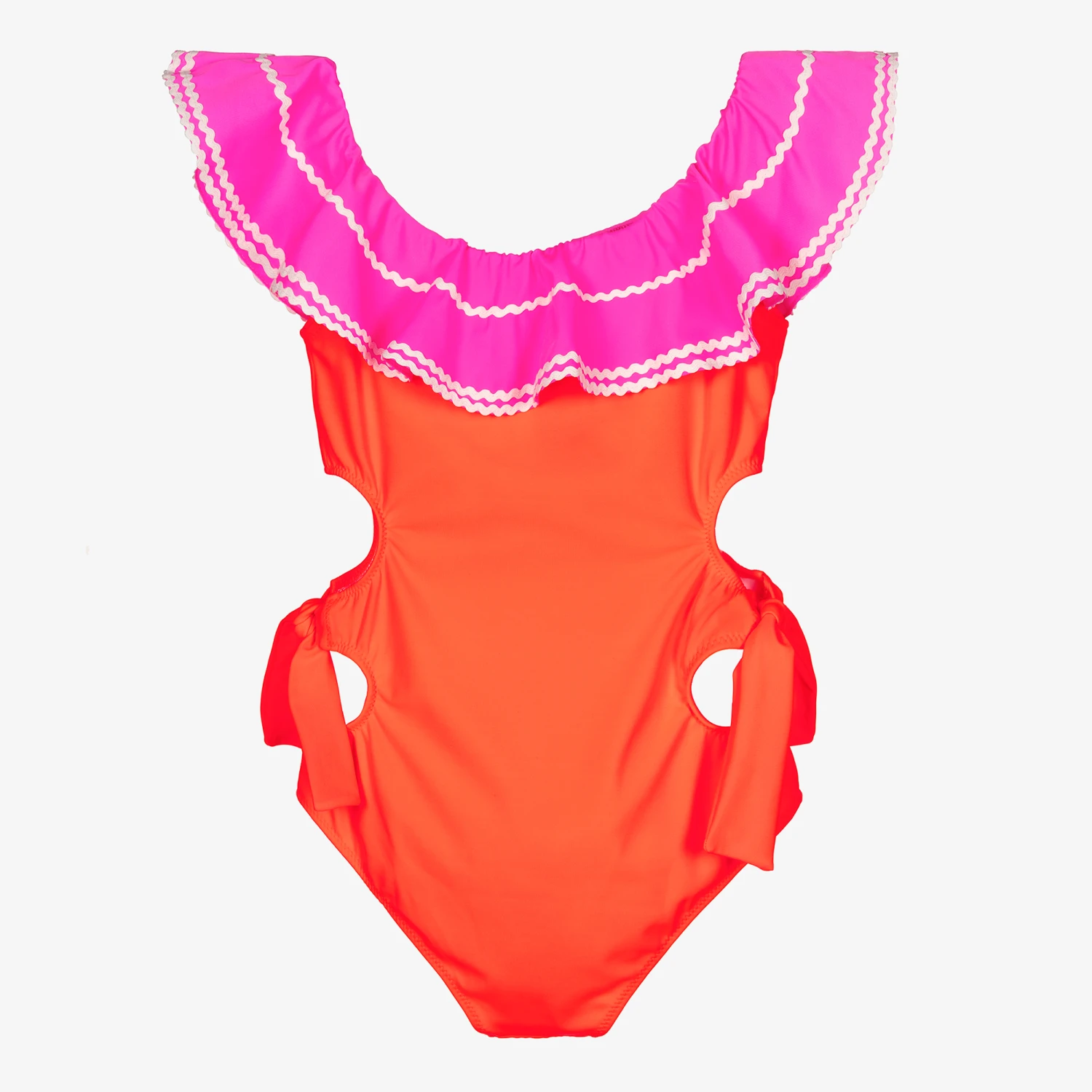 Teen girls fluorescent orange swimsuit by American brand Nessi Byrd, made and lined in soft and stretchy nylon. There is a fluorescent pink ruffle trim on the neckline with white ric rac edging, along with elegant cut-out details on the sides, with tied knots. It provided useful UV50 protection for peace mind whilst enjoying the sun.
