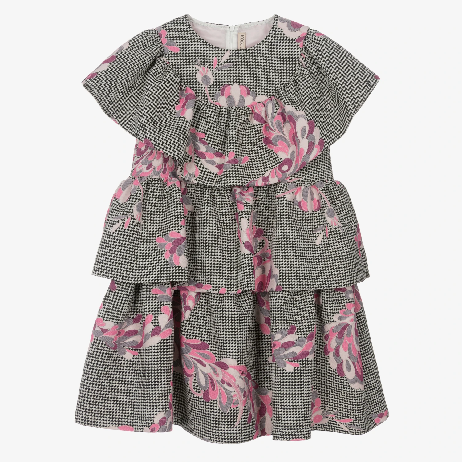 From luxury Italian brand Emilio Pucci, this stunning black and white houndstooth dress is for teen girls. Woven in a soft and mid-weight cotton blend, this lovely dress is decorated with the designer’s gorgeous pink and purple-grey jacquard Lilly pattern. Elegant and head-turning, there are elegant frills across the shoulders and on the skirt for a truly feminine look. It is comfortably lined with silky cupro and fastens with a concealed zip on the back.