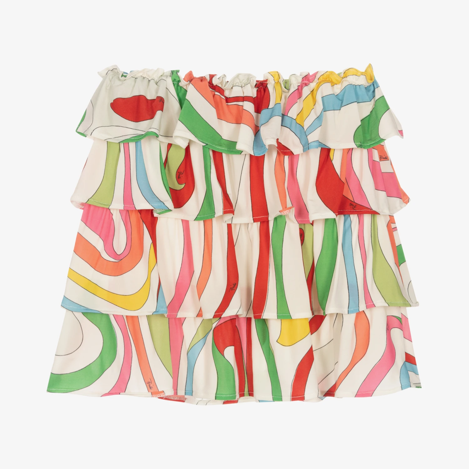 From Italian brand Emilio Pucci, white skirt patterned with a colourful Marmo print for teen girls. Silky smooth and lightweight, this beautiful skirt has layered tiers for a feminine silhouette and an elasticated waist for comfortable, easy wear.