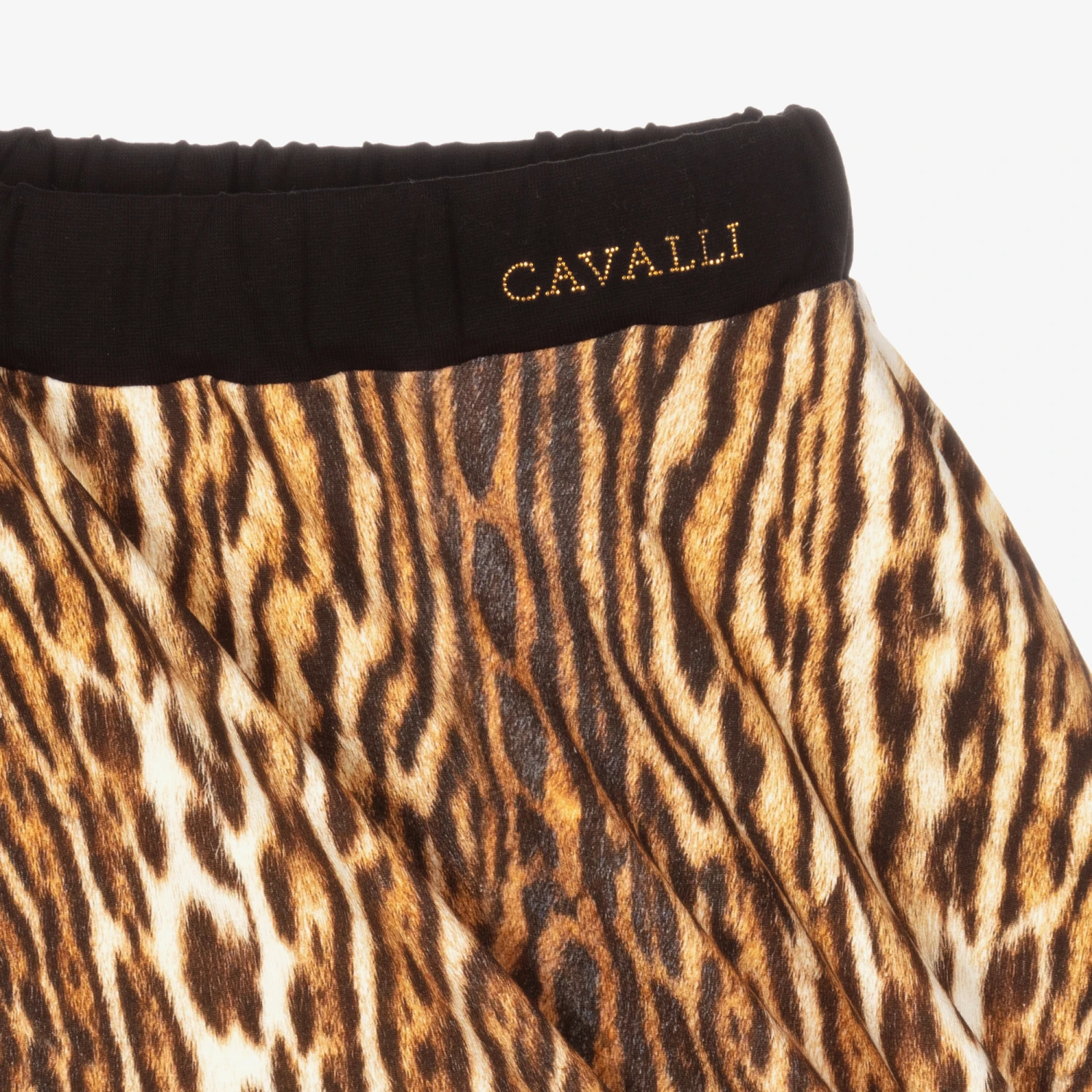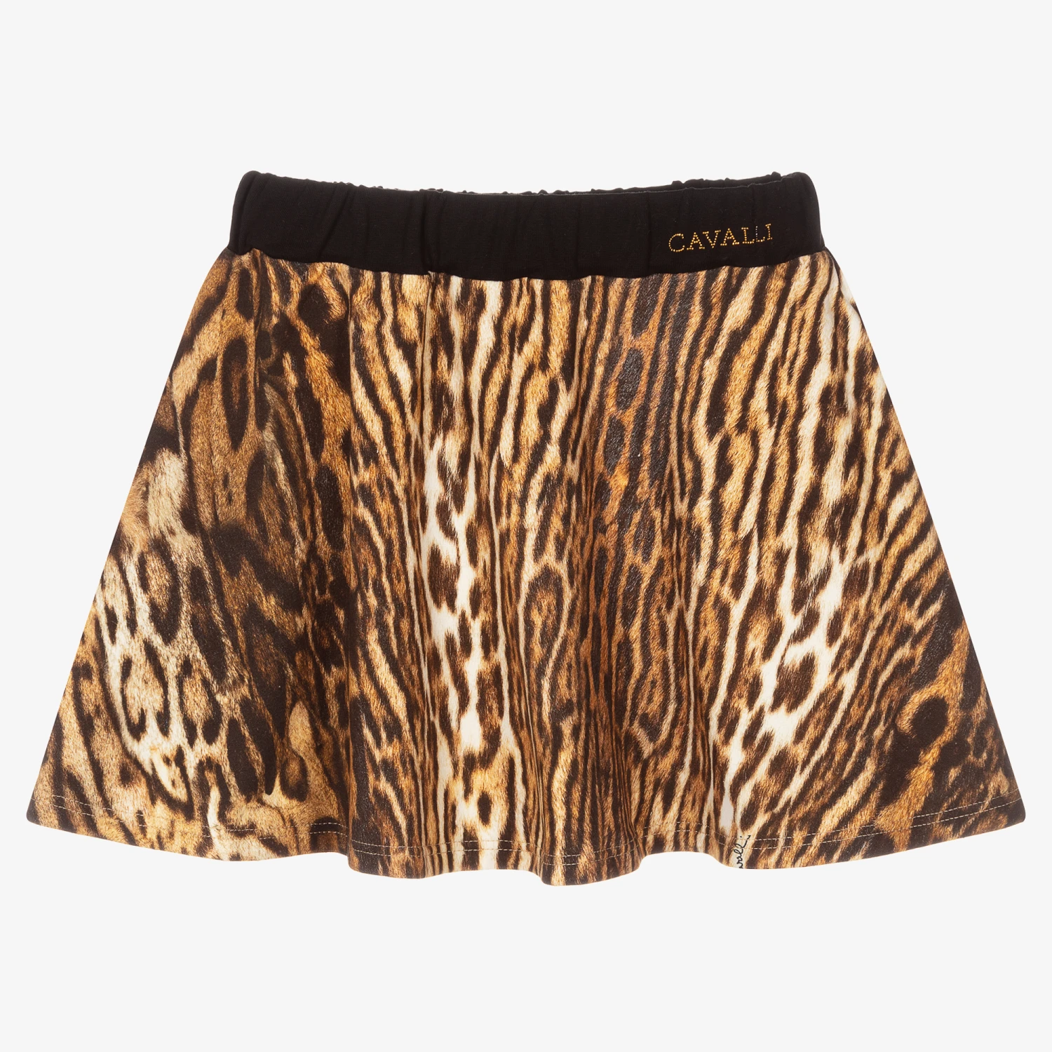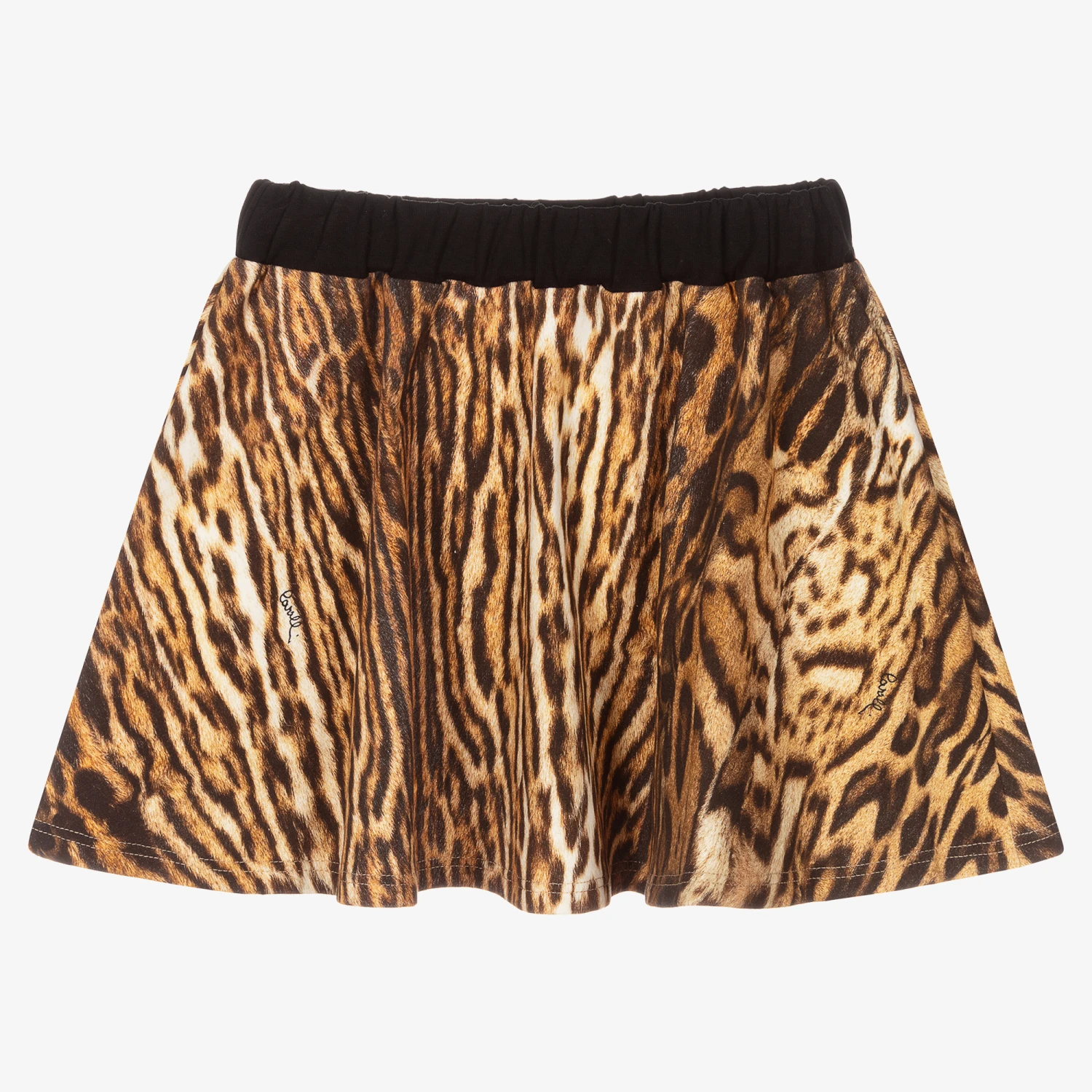 Stylish skirt for teen girls by Roberto Cavalli, with a signature ocelot animal print. Made in soft mid-weight jersey, with a brushed fleecy inside, it has a flared shape and a black stretchy waistband with a gold logo print.