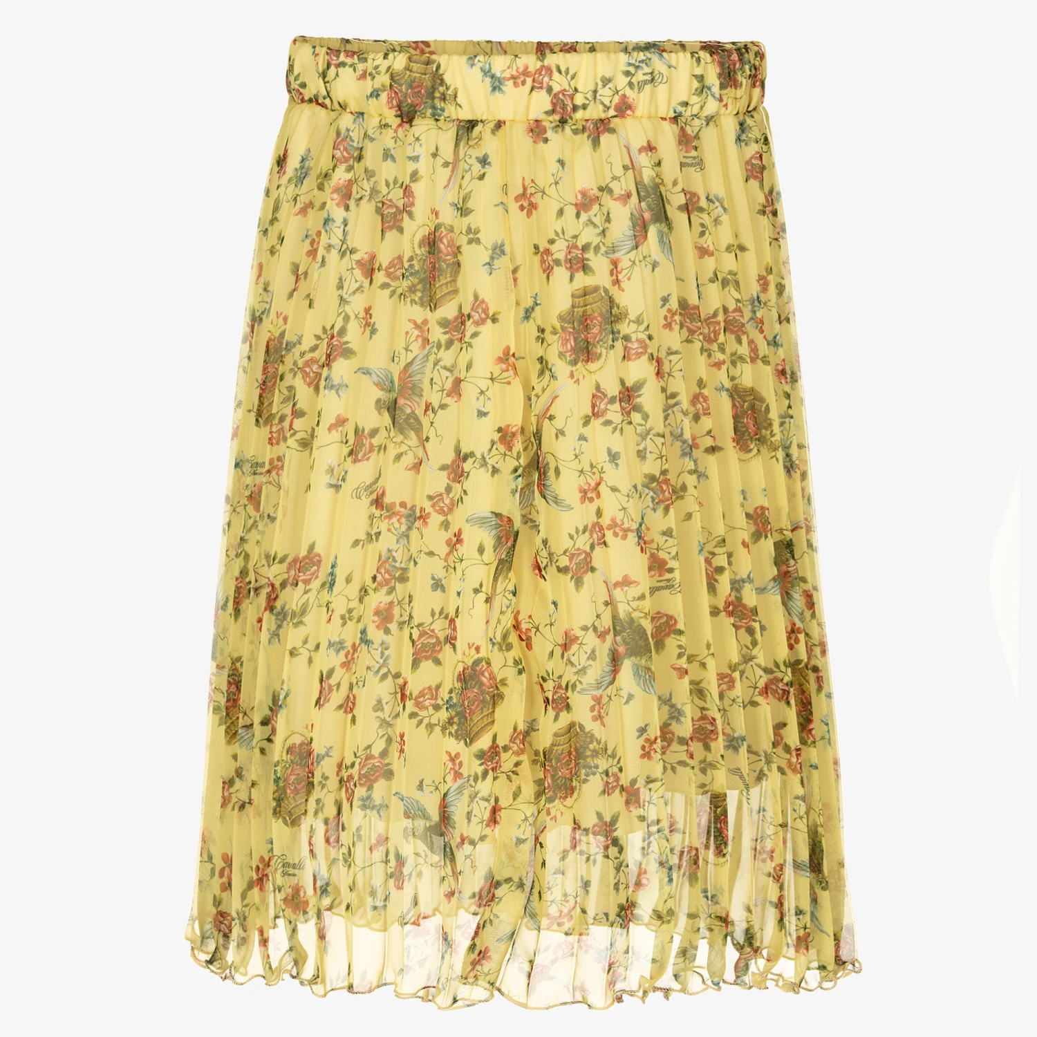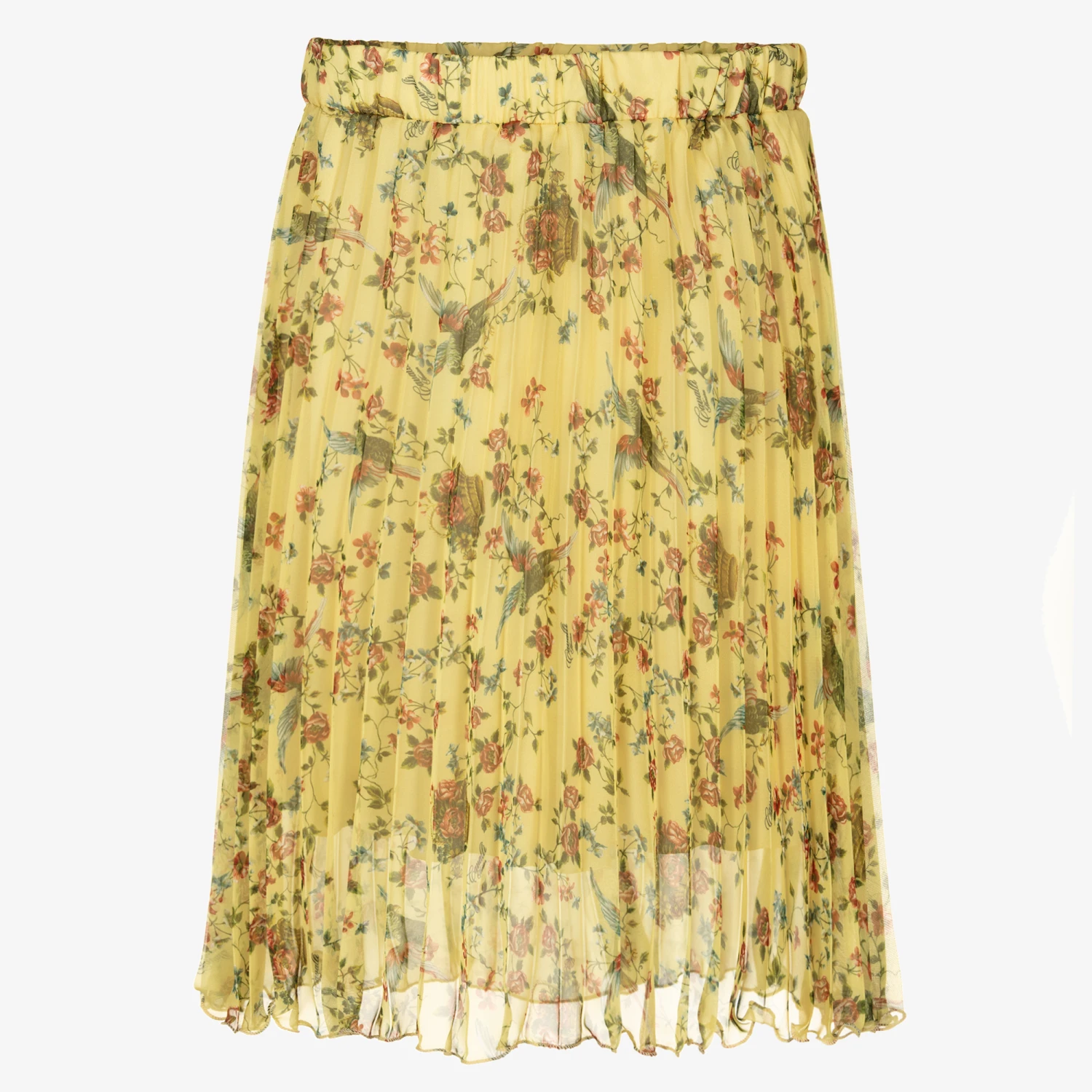 Pretty yellow pleated skirt for teen girls by luxury Italian brand Roberto Cavalli. Made in sheer, lightweight chiffon, it has a gorgeous vintage-inspired pink floral and tropical bird print, with the brand’s signature Cavalli Mansion logo. It has a lightweight lining for comfort, which is slightly shorter than the skirt.