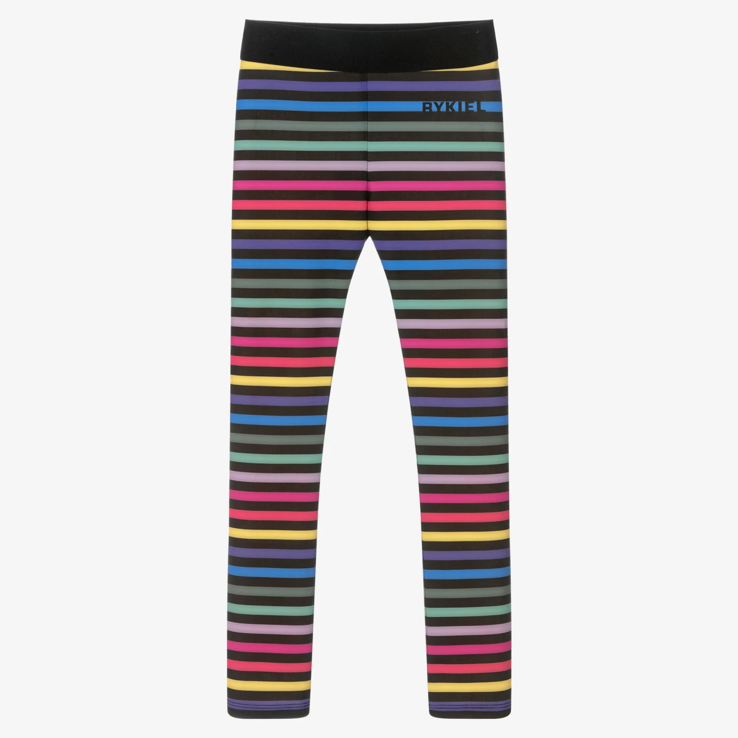 Fun sports leggings for teen girls by Sonia Rykiel Paris, with a bold, colourful striped pattern. They have a black logo printed just below the elasticated waistband for a discreet branded touch. Designed for comfort, they are made in silky stretch lycra.