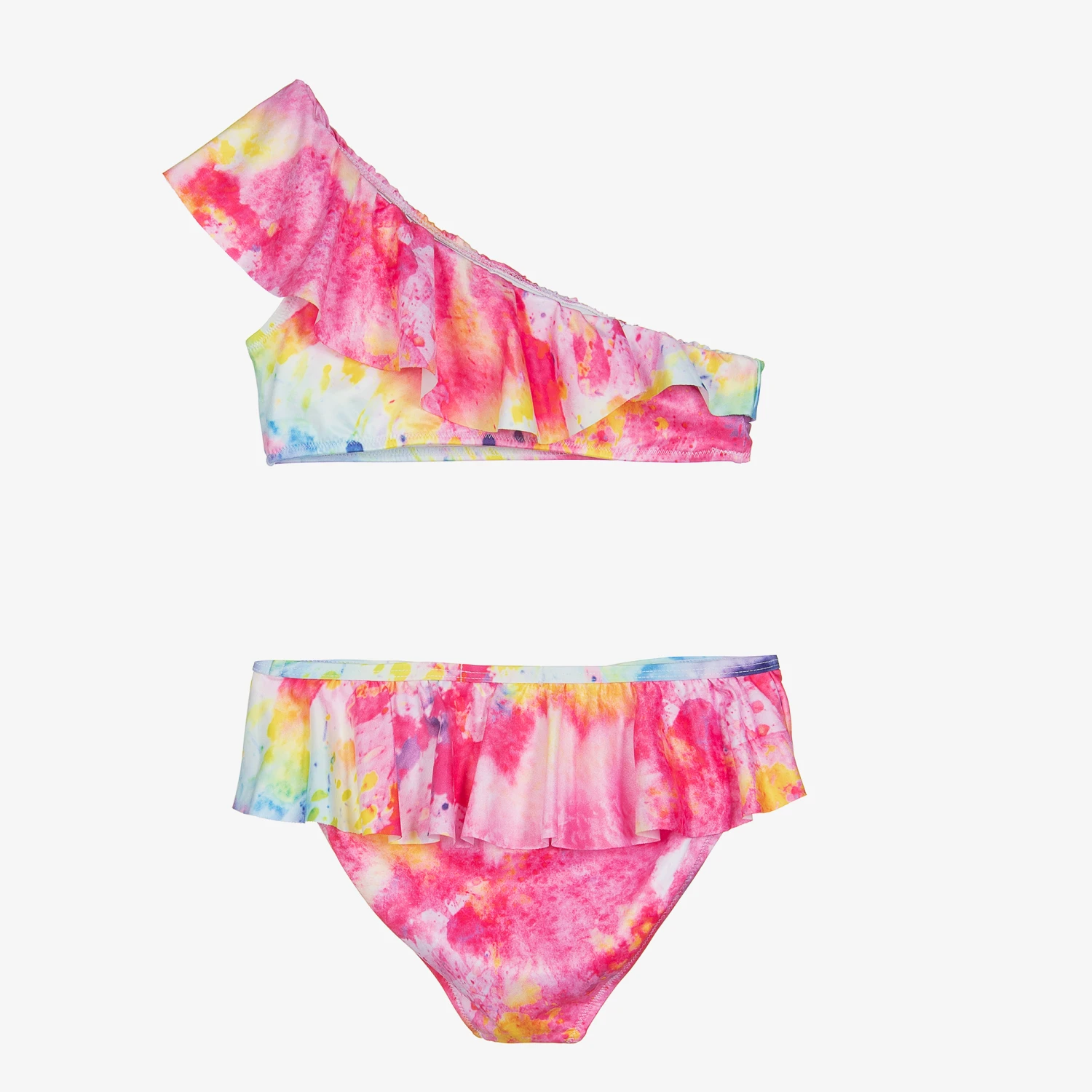 Gorgeous pink bikini for teen girls by Stella Cove, with a paint effect pattern that includes shades of blue and yellow. A stylish asymmetric one-shoulder design, it has gorgeous ruffle trims for a stand-out look. Made in smooth and stretchy fabric, both pieces are fully lined for comfort.