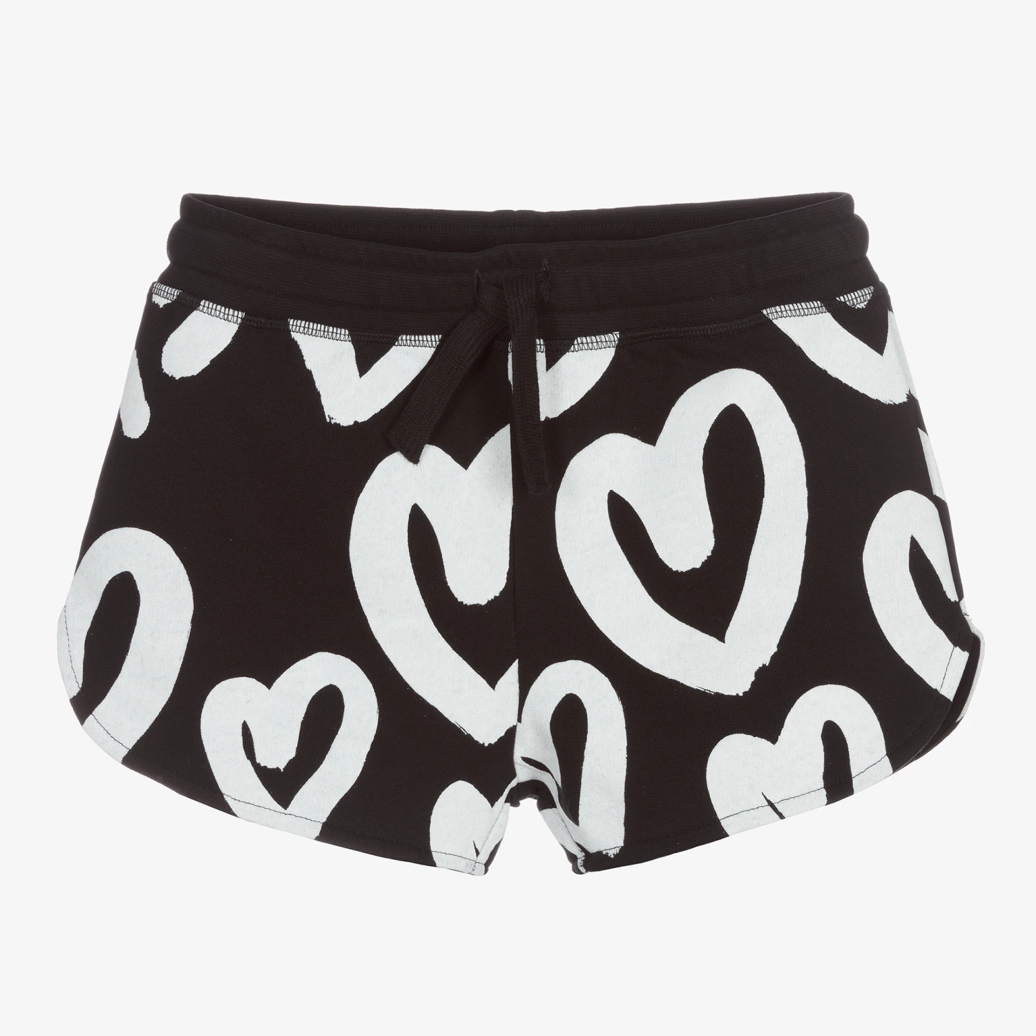 Teen girls black and white shorts by Stella McCartney Kids, made in mid-weight organic cotton jersey. They have a white heart pattern and a comfortable drawstring waistband.