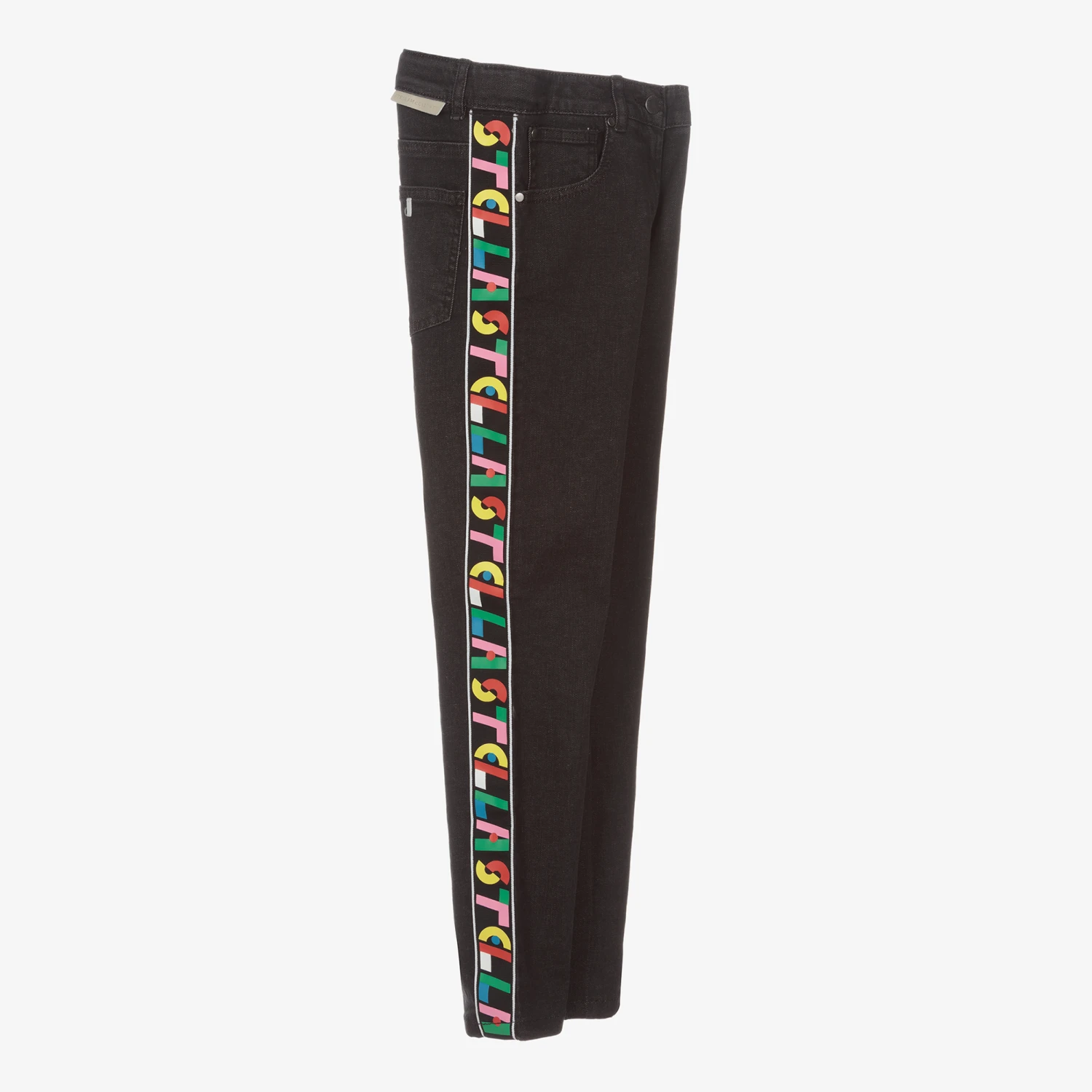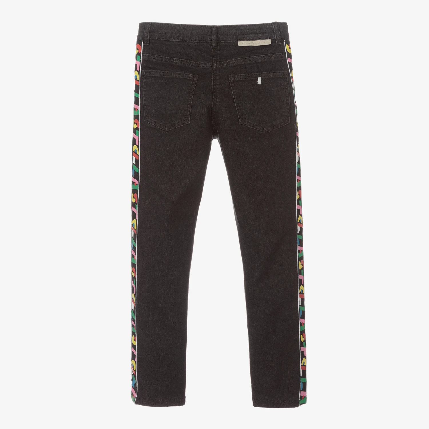 Black jeans for teen girls by Stella McCartney Kids. Stretchy and lightweight, they are made in organic cotton denim and have contrast grosgrain logo taping down the legs for a boost of colour. Classic style features include five pockets, logo rivets and belt loops. They fasten with a hook and eye and zip, with an adjustable waistband for fit.