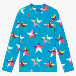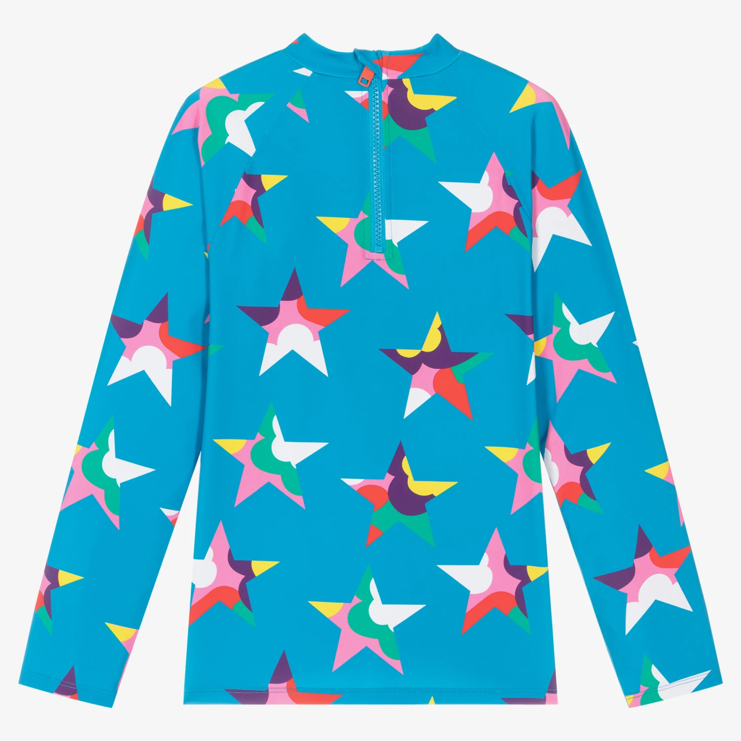 Quirky bright blue sun top for teen girls by Stella McCartney Kids, with UPF 50+. The fabric is stamped with cool abstract star graphics in a vibrant array of colours. Great for the pool or beach, this long-sleeved top has a chunky zip on the back and sporty raglan sleeves. Silky and stretchy, it is made in recycled jersey for an eco-conscious impact.