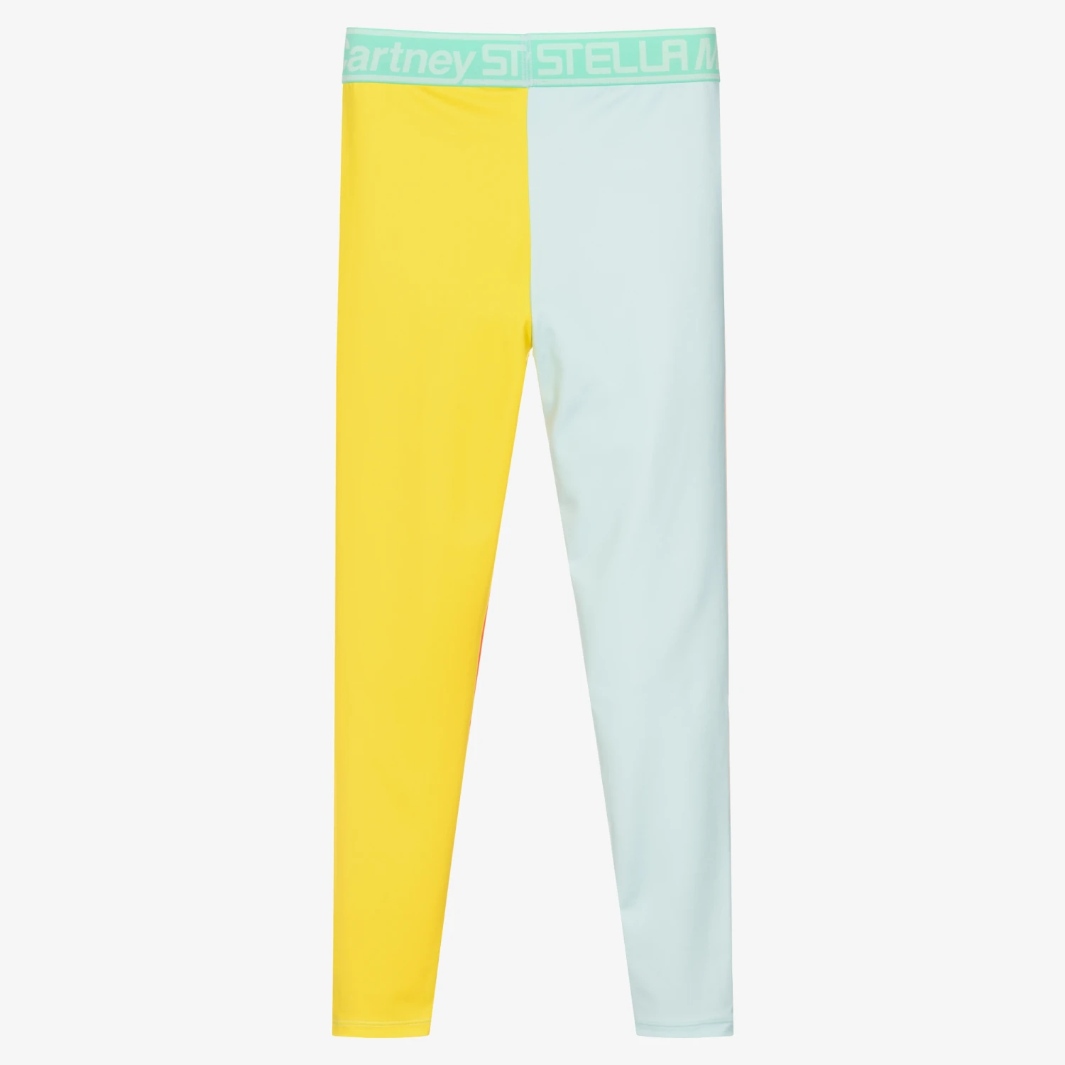 Sporty leggings for teen girls by Stella McCartney Kids, in colourblocks of pink, red, pale blue and yellow. Made with recycled fibres, these technical jersey leggings are fast-drying, moisture-wicking and breathable for comfort. For a designer finish, they have a stretchy green waistband with a white jacquard logo design. The Stella McCartney fit can be quite small so choose a size up if you want room to grow.