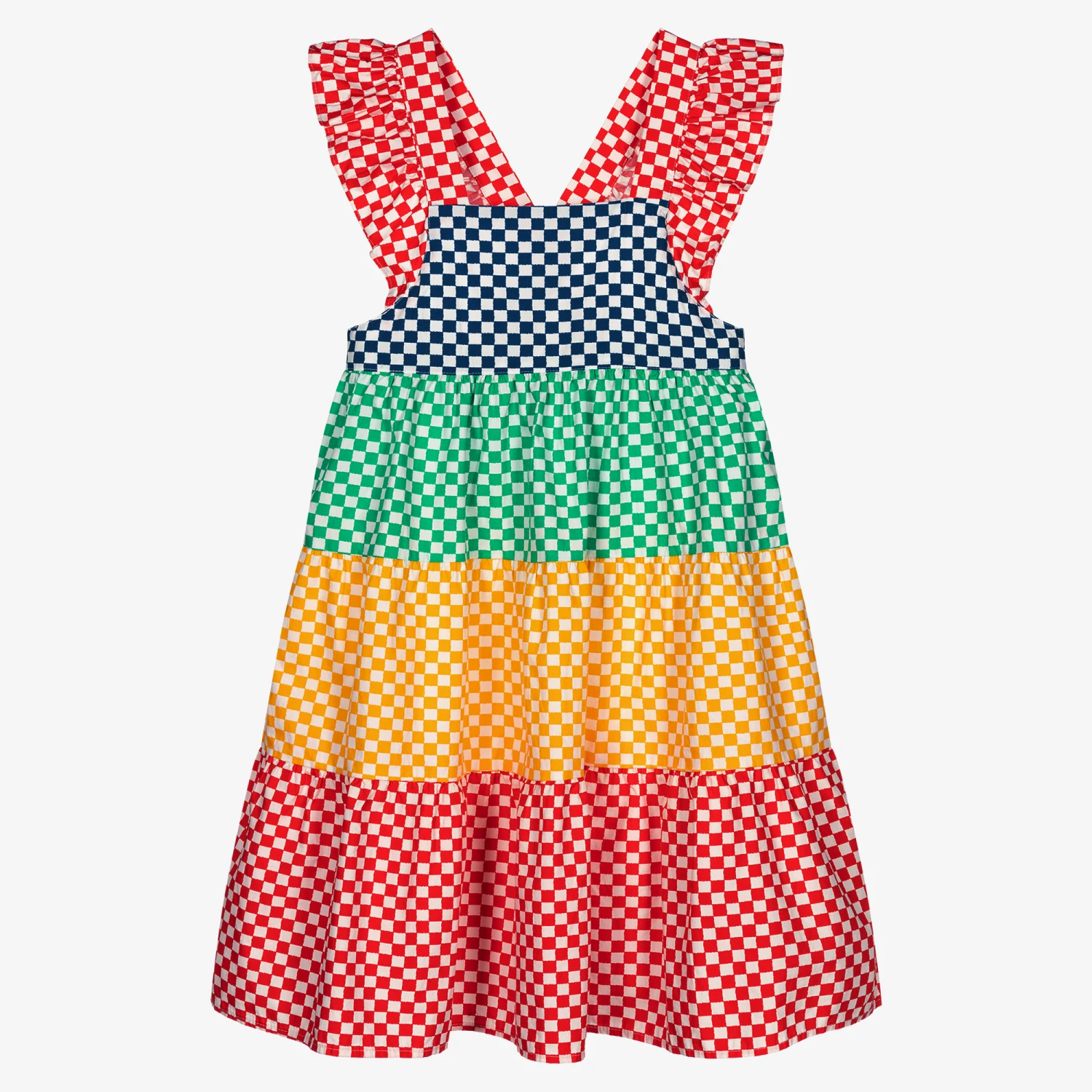 Summery dress for teen girls by iconic British designer Stella McCartney Kids, made in lightweight organic cotton. It has colourblock tiers of blue, green, yellow and red checks on a white background, with ruffles over the shoulders and a lined bodice. The adjustable shoulder straps cross over the open back and button onto the elasticated waistband.