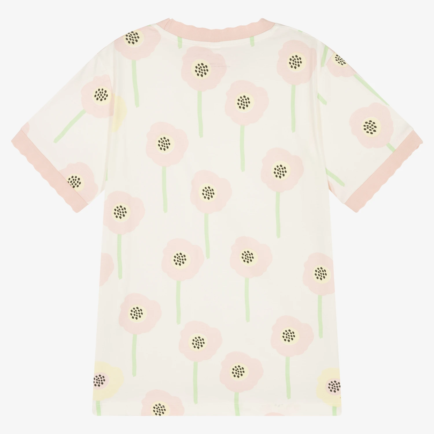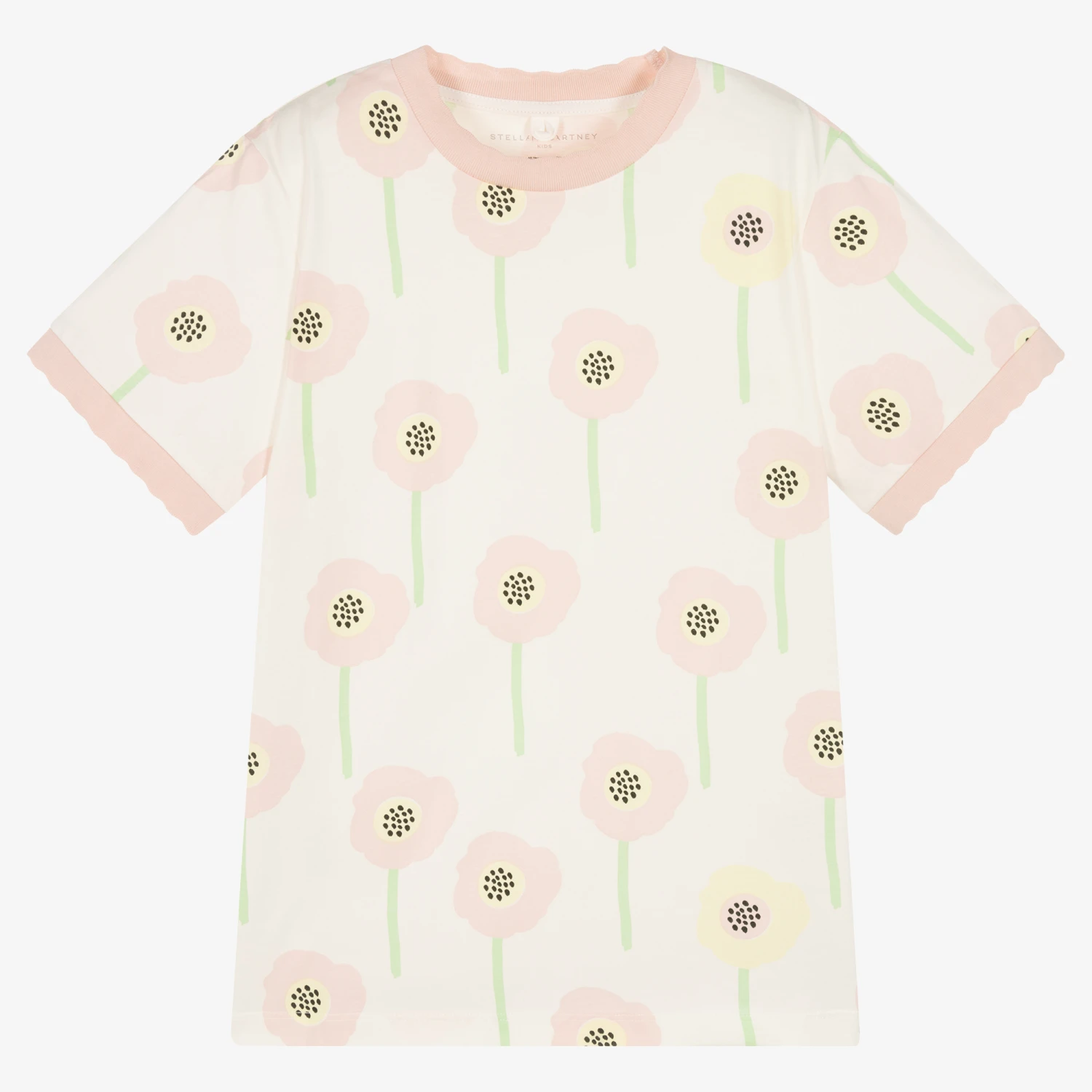 A pale ivory T-shirt for teen girls by Stella McCartney Kids. Famous for their fun and quirky prints, the British label has designed this cool top with pink, yellow and green floral artwork. It is made in soft organic cotton jersey, with pink scalloped trims. The Stella McCartney fit can be quite small so choose a size up if you want room to grow.