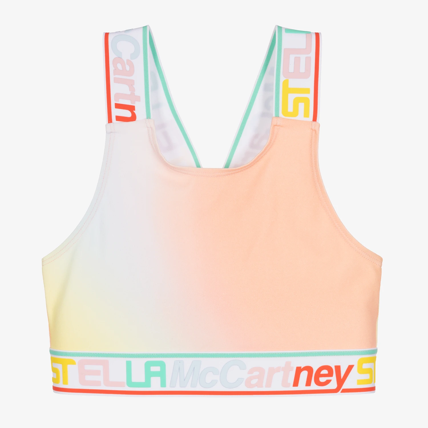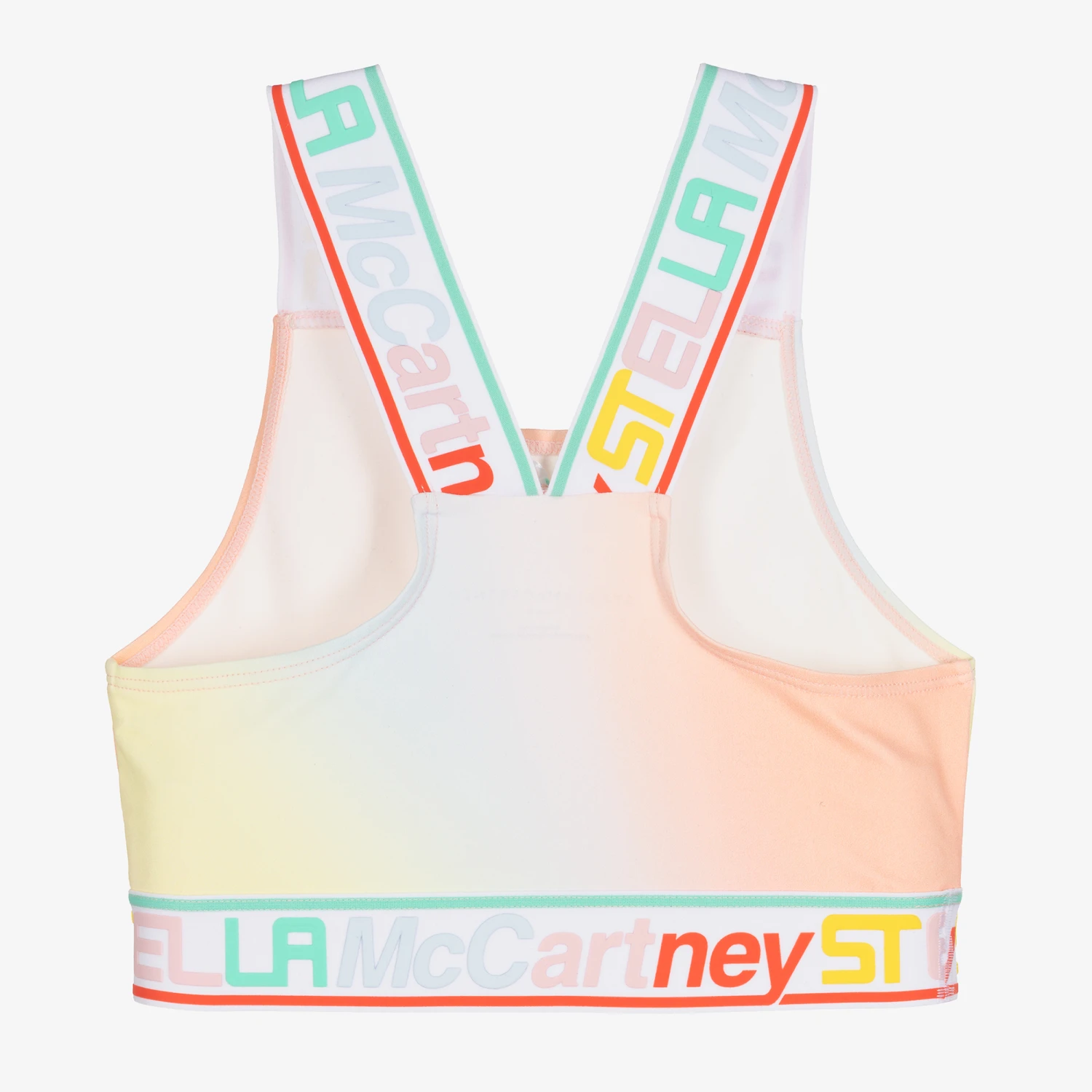 Pastel pink and yellow ombré sports bra top for teen girls by Stella McCartney Kids. Silky smooth and stretchy, it is made from recycled materials. Great for activewear, the quick drying fabric wicks moisture away, keeping the wearer dry and comfortable. The elasticated shoulder straps and underband have bold and colourful logo branding for an eye-catching designer look.