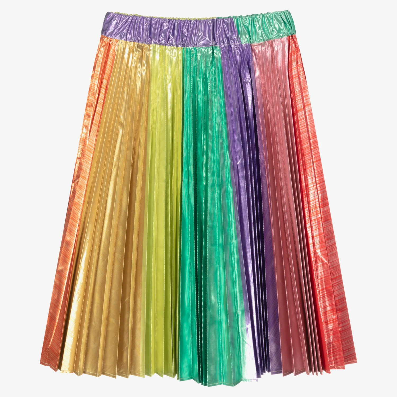 A rainbow striped taffeta skirt for teen girls by Stella McCartney Kids, with a standout metallic sheen. Colourful and upbeat, this pleated skirt is cut from lightweight fabric with a shorter-length cotton lining for added comfort. Made from recycled materials, it is easy to wear with a comfortable elasticated waistband.