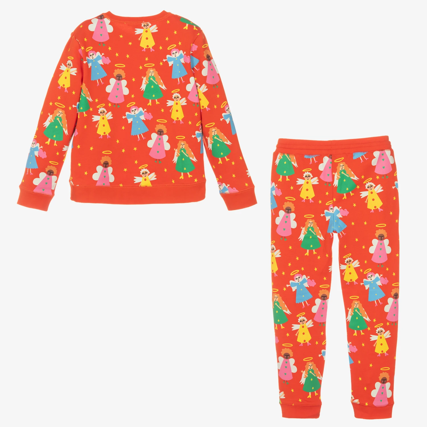 Delightfully festive red tracksuit for teen girls by Stella McCartney Kids, made in organic cotton jersey with a warm fleecy inside. Showcasing an arty take on traditional festive detailing, this bold tracksuit has a colourful angel print. The comfortable joggers have an elasticated waist with adjustable drawstring ties for a great fit.