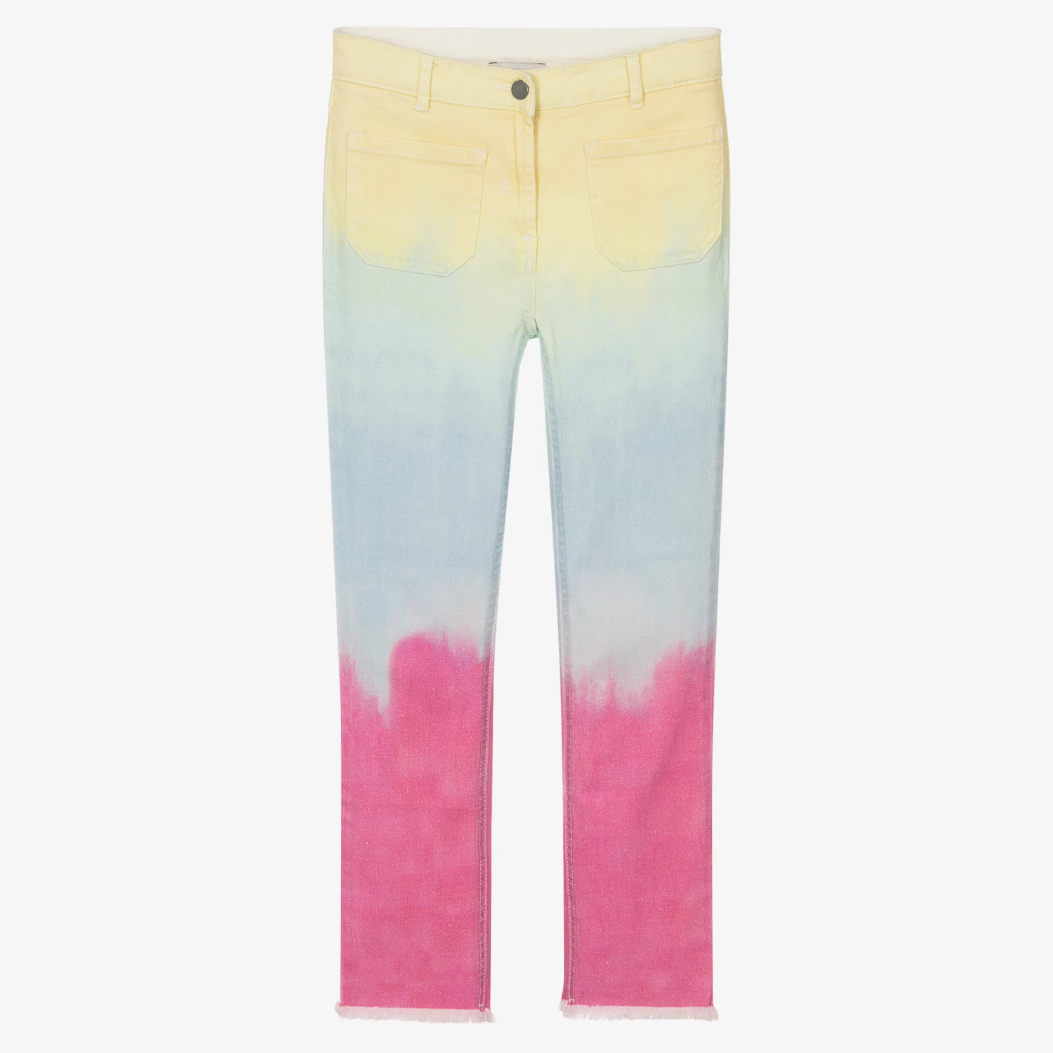 Multicoloured tie-dye effect denim jeans for teen girls by Stella McCartney Kids, made in organic cotton. The head-turning bright colours ensure they make a bold statement, and logo tab on the back provides a subtle designer touch. They have a classic straight leg with quirky finishes such as frayed hems and front drop pockets. Fastening with a zip and hook, they are finished with an adjustable waist allowing for a better fit.