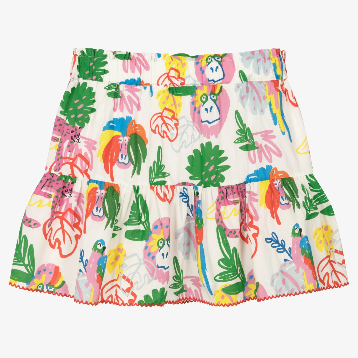 A tropical white skirt for teen girls by Stella McCartney Kids, designed in a bright and colourful parrot print. Made from breathable and lightweight cotton, this multicoloured style features a gently elasticated waist and a red embroidered trim on the hemline for a textured finish. The Stella McCartney fit can be quite small so choose a size up if you want room to grow.