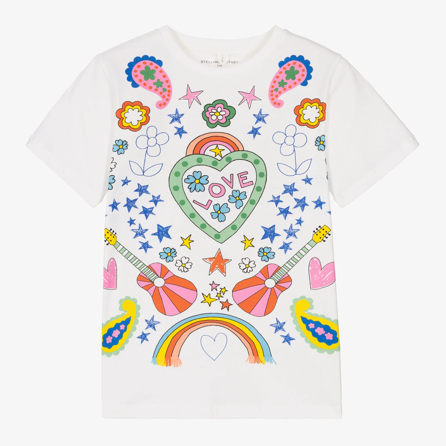 Designed by Stella McCartney Kids, this playful white T-shirt is for teen girls. Casual and versatile, it has colourful 60’s-inspired rainbows, guitars, hearts and paisley prints for a quirky look. This updated white tee is made in soft organic cotton jersey for casual comfort. The Stella McCartney fit can be quite small so choose a size up if you want room to grow.